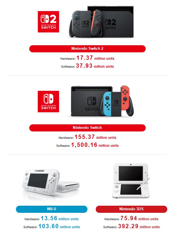 Meanwhile, the original Switch is slowing down. Nintendo says it sold 3.25 million Switch units over the same nine-month period, a 66% year-on-year drop, bringing lifetime hardware sales to 155.37 million. Nintendo also reported 129 million annual players on Switch between January and December 2025, slightly down from 130 million in 2024.