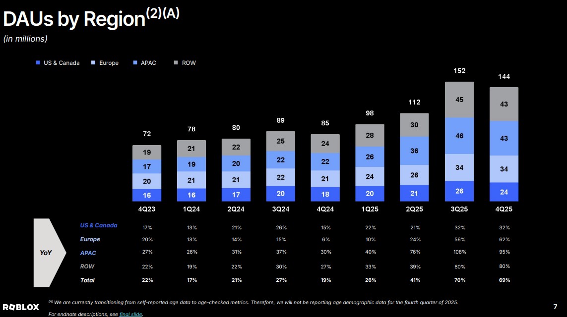 On the safety side, Roblox recently expanded age verification requirements tied to chat access. Roblox began global age checks in early January 2026, and said that as of January 31, 45% of DAUs had been age-checked. Of users who completed the process, Roblox said 35% were under 13, 38% were 13 to 17, and 27% were 18+.
