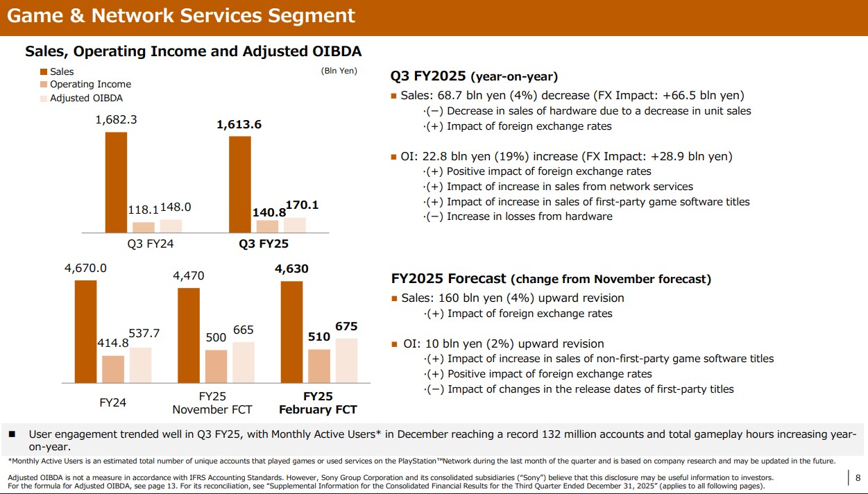 Sony also pointed to growth on the services side. Monthly active users hit 132 million by the end of the quarter, up from 129 million in December 2024. In Q3, digital game and add-on content sales rose 6% to ¥761.5 billion ($4.8 billion), while network services revenue increased 12.6% year over year to ¥199.2 billion ($1.2 billion).