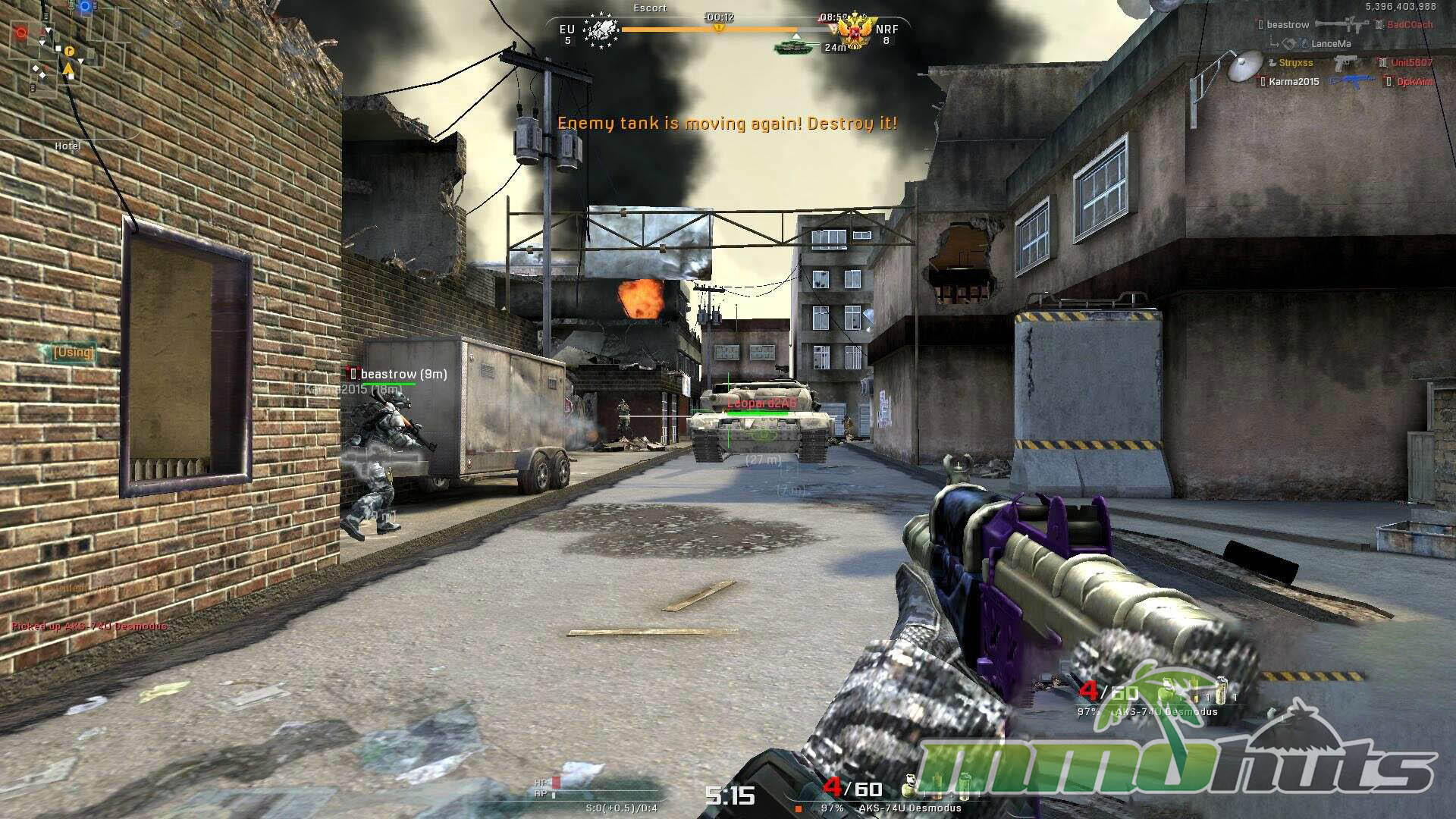AVA’s mode list covers the familiar bases while still offering enough variety to avoid feeling like “only one playlist.” Demolition is the classic bomb plant and defuse formula, while Annihilation delivers straightforward team deathmatch pacing. Escort stands out as a more objective-driven option, sharing the same general concept as payload modes in other shooters, where one side advances a tank by staying close while defenders try to halt progress, including using RPGs to destroy the vehicle.