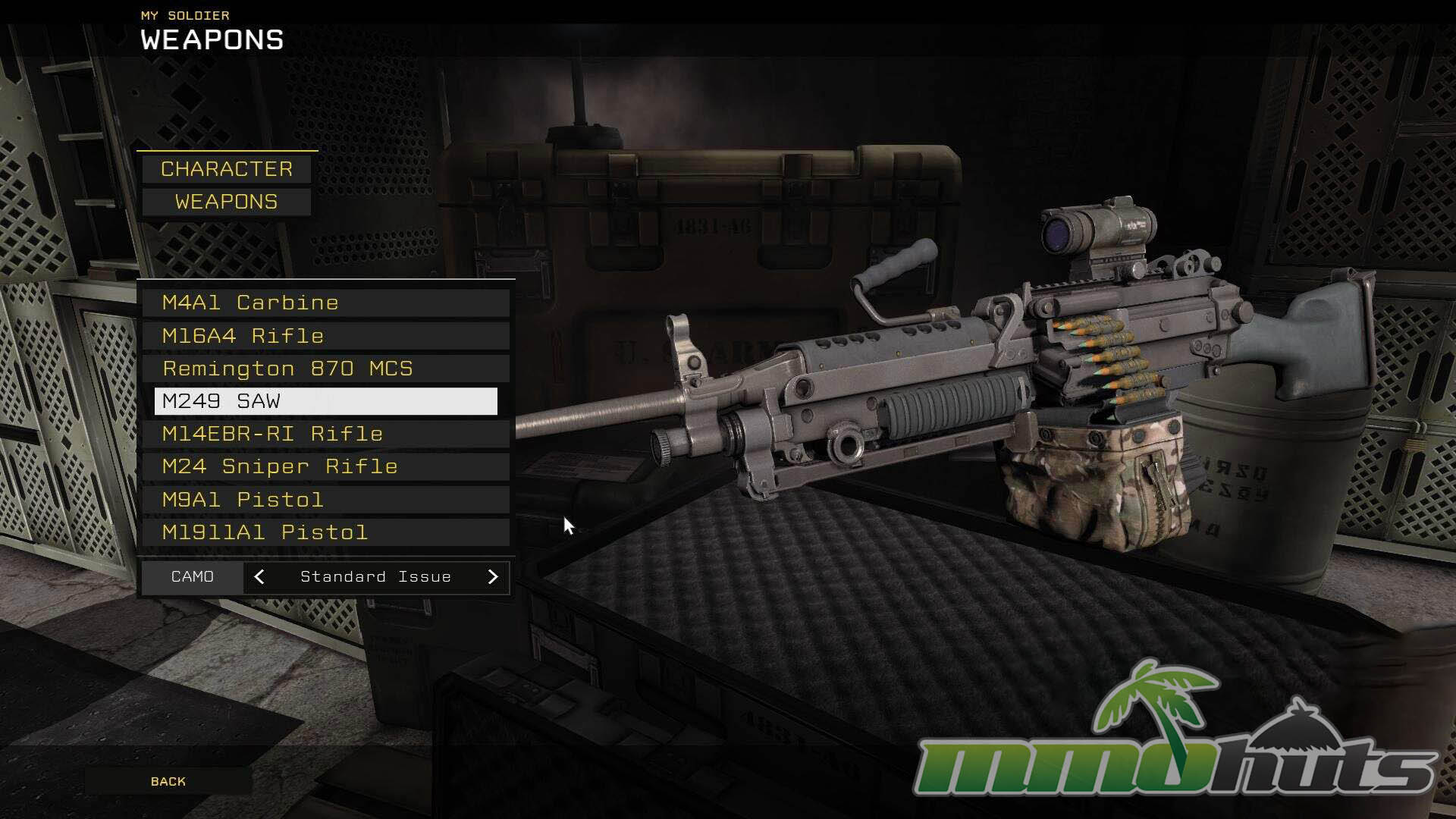 Right after logging in, you can spend time in menus setting up your soldier, or skip ahead to training and matchmaking. The “My Soldier” area lets you adjust appearance options tied to roles, including uniform camo patterns, visible kit choices that change your silhouette, and weapon camo styles.
