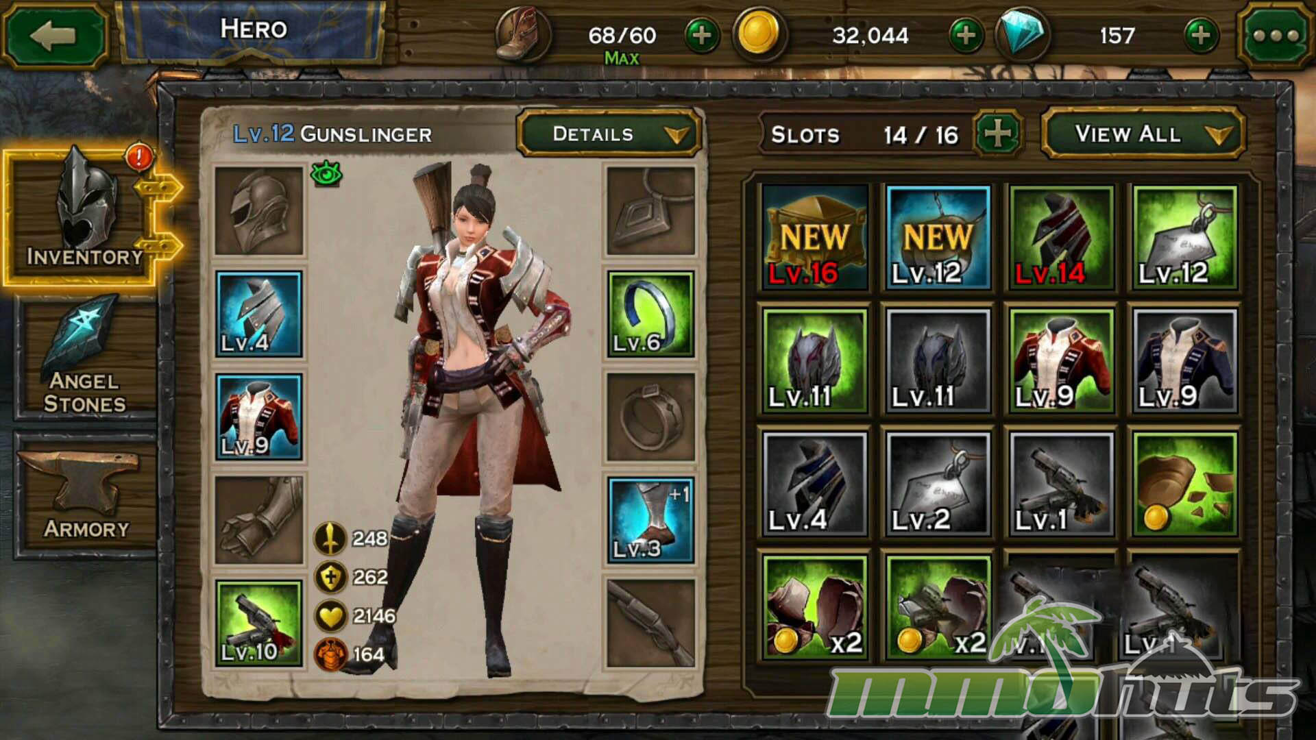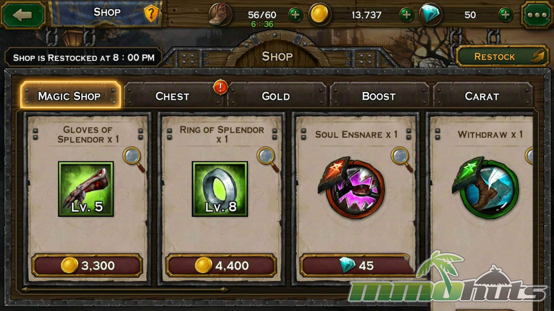 Angel Stone’s shop is structured around a premium currency called Carats, but it is relatively generous with free sources through logins, achievements, and quests. The Magic Shop rotates its offerings every couple of hours, letting you buy gear and Angel Stone Shards using either gold or Carats. The number of visible item slots starts small, and additional slots can be purchased.