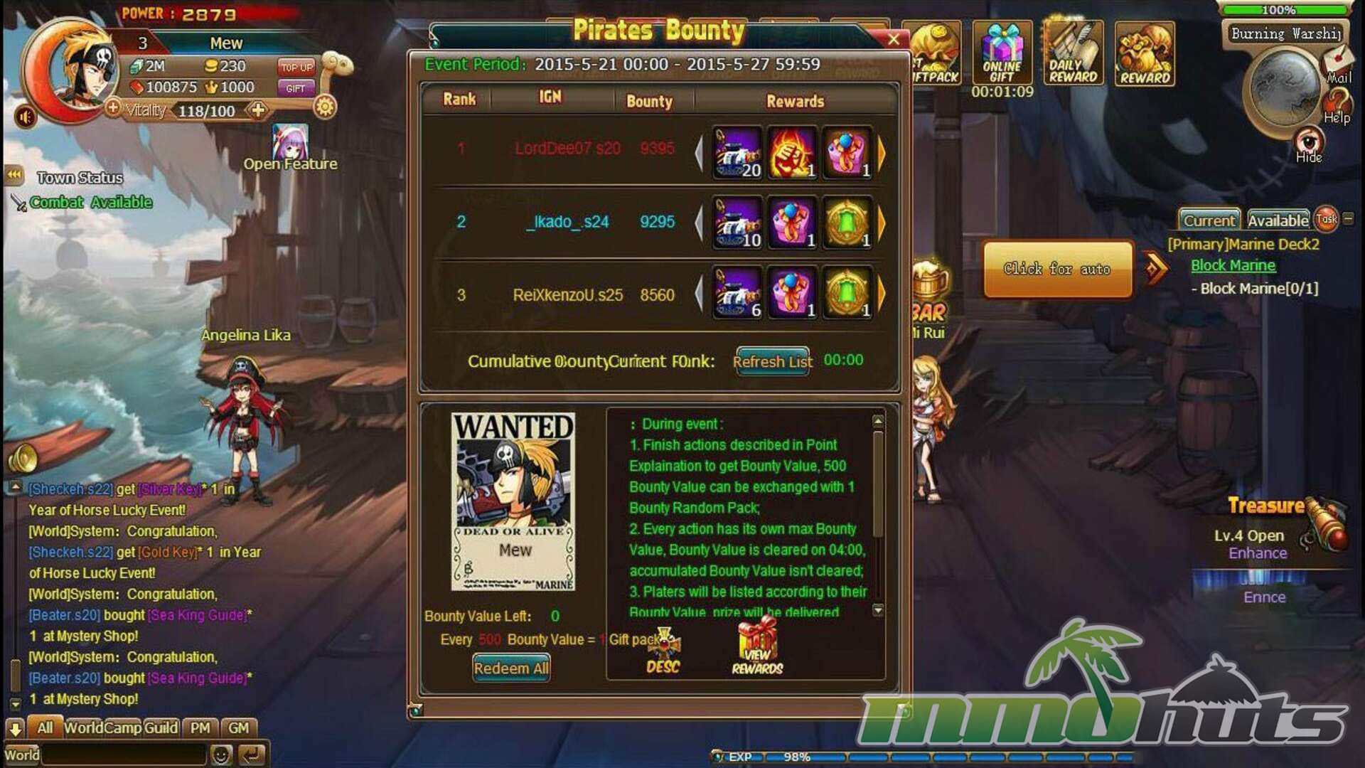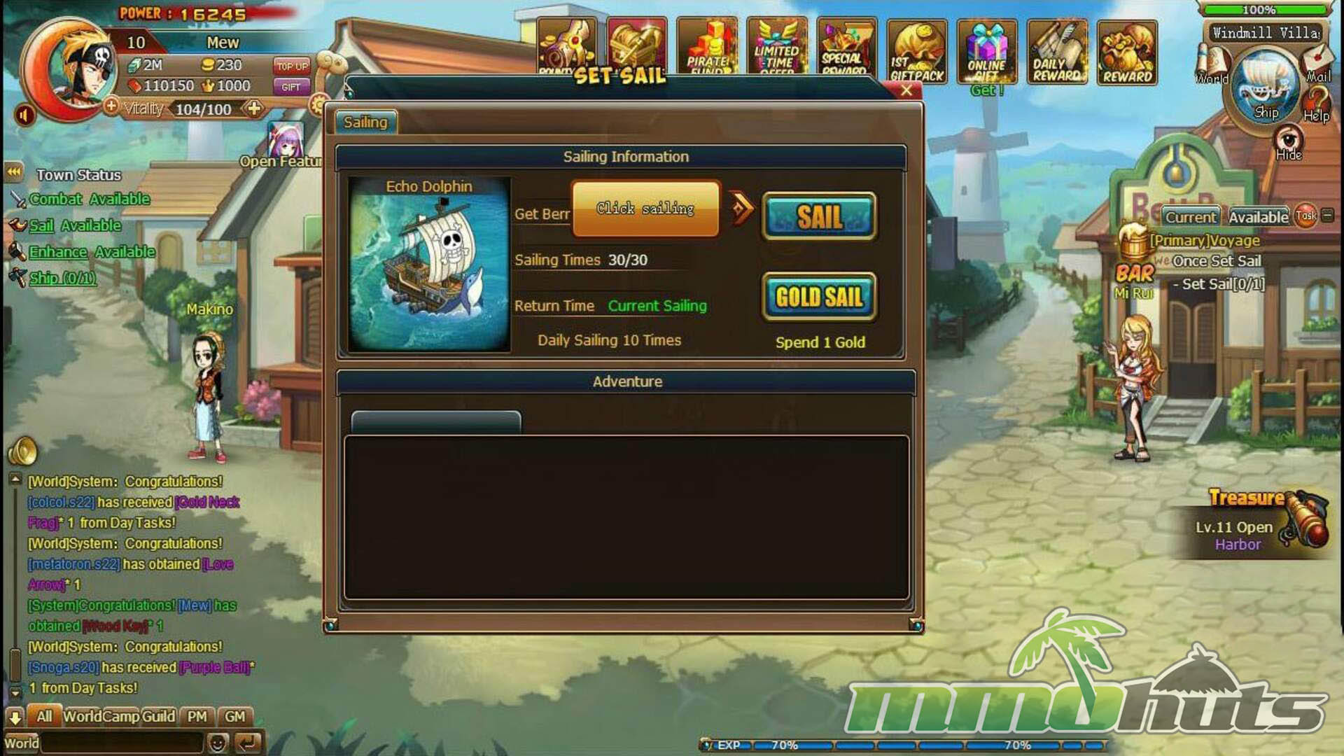 At the start, players picked one of six classes (Summoner, Sword Woman, Magician, Warrior, Gunner, or Archer), each modeled after familiar anime archetypes. From there, the game pushed you toward collecting and improving additional characters, then using them to tackle PvE content and, for those who wanted competition, a PvP arena. A standout feature for this style of browser MMO was the pirate ship hub, which acted as a central place to manage upgrades and reinforce the “crew” fantasy. Presentation was generally consistent for a Flash-based title, and the soundtrack did a lot of work in giving the game a more adventurous tone.