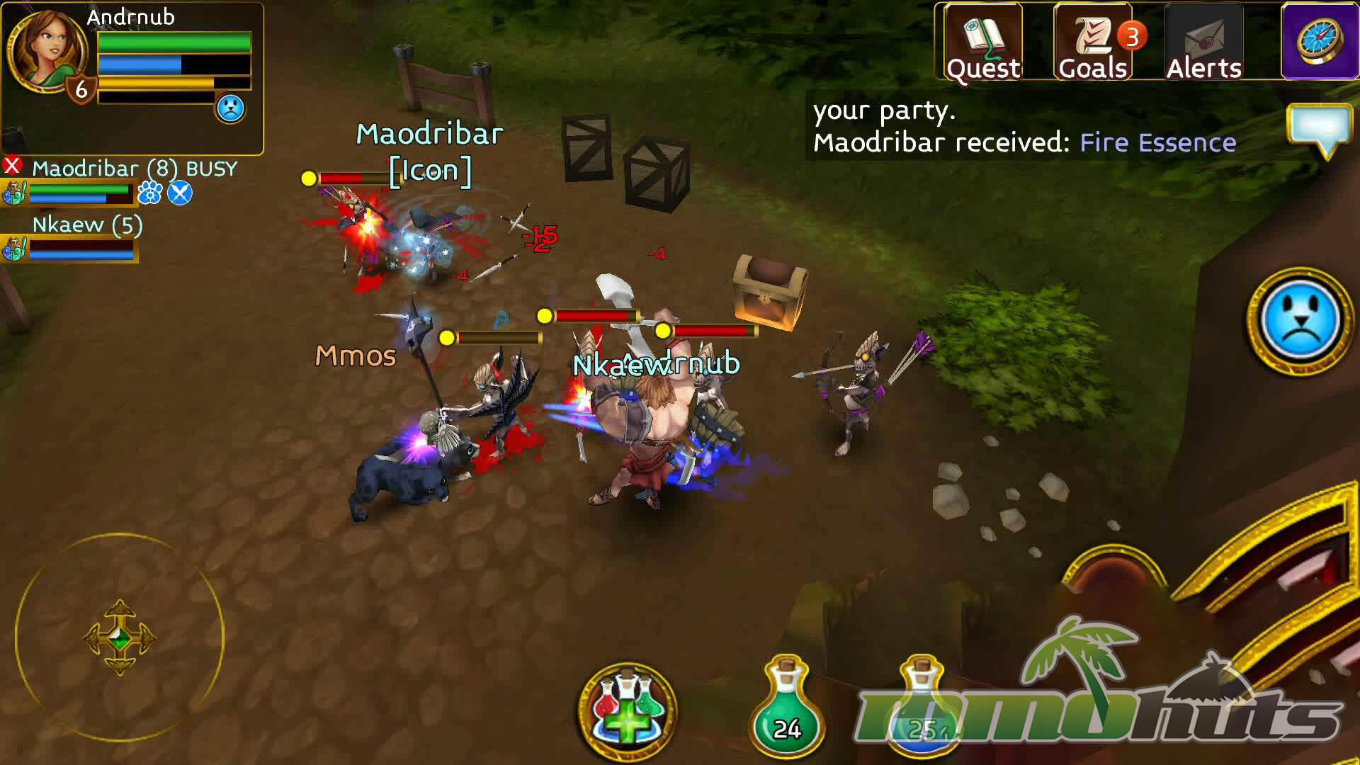 Combat is built for touch controls and quick decision-making. Movement is handled through a virtual joystick, while the camera sits in a fixed isometric view that keeps enemies and effects easy to track. Attacking is mapped to a single button, tap for a basic strike, hold and release for a stronger action, which keeps moment-to-moment play simple while still leaving room for skill timing and positioning.