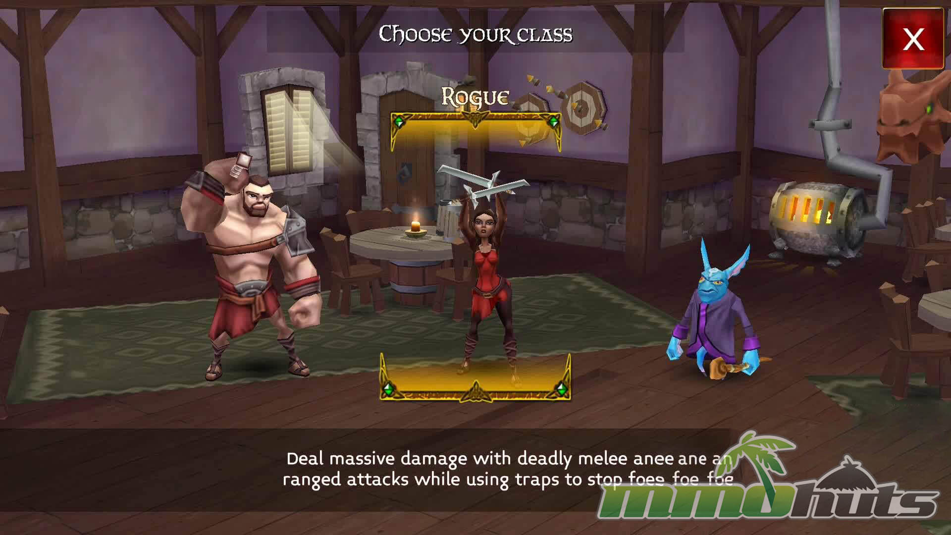 Character customization is fairly light. Classes are locked to specific gender and race presentations (Warrior is a human male, Rogue is a human female, and Sorcerer is a small blue male creature), so you are mostly choosing minor appearance tweaks like face and hair options rather than building a fully custom avatar. It is functional for a mobile MMO, but players who prioritize deep character creation will notice the limits quickly.