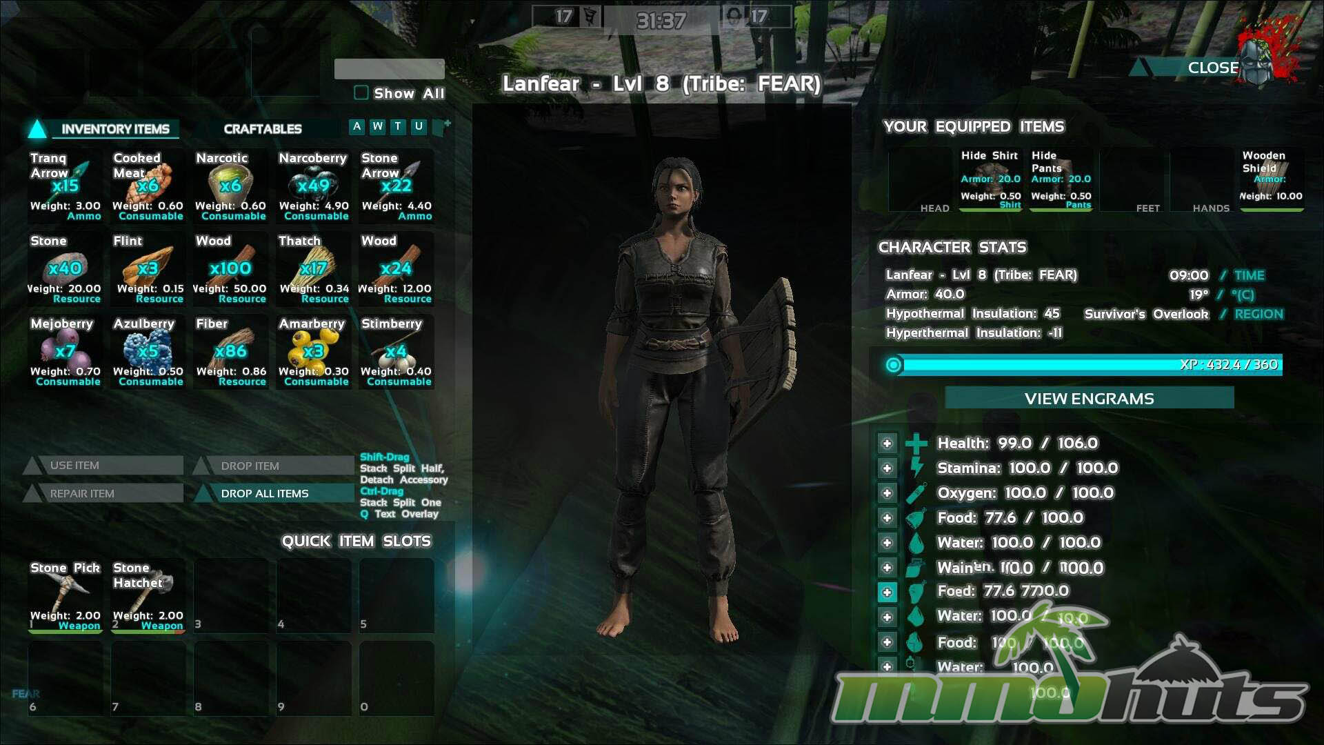 ARK’s crafting system is the backbone of ASotF. You harvest resources, convert them into tools, then upgrade into stronger options as you level. Progression is faster than in ARK: Survival Evolved, with boosted experience and gathering rates to fit match time limits, and crafting durations are shortened to keep momentum. Even so, crafting still demands planning, you need to know what to prioritize, what to skip, and when to stop farming and start rotating. Primitive gear breaks, so carrying backups is not optional, it is a core part of staying alive.