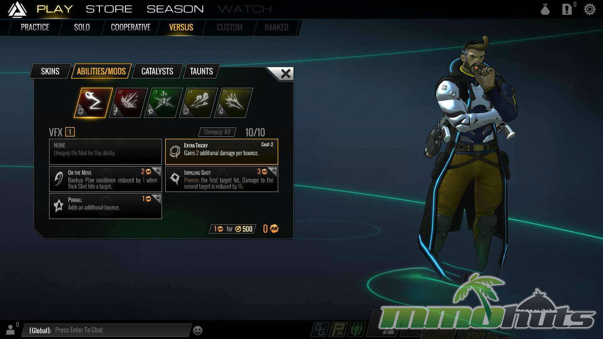 Outside of Practice, matches award ISO and experience. ISO functions as the main earnable currency and can be spent on cosmetics like skins and taunts, as well as mod tokens used to adjust abilities. ISO can also be converted into Credits, the premium currency. Credits are available through purchase and can be used for items like GG boosts that temporarily increase ISO and experience gains.