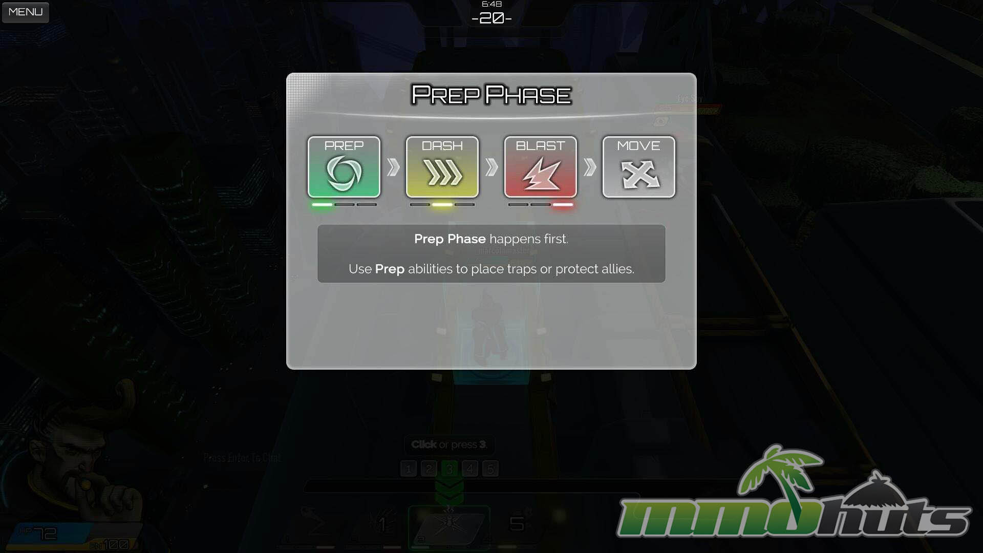 On each turn you can select one of three action types, Prep, Dash, or Blast, plus a Move. Prep skills usually set up delayed effects, such as buffs or attacks that trigger later. Dash abilities reposition you during the dash phase, often letting you dodge incoming hits and sometimes dealing damage as you move. Blast is where most direct attacks and immediate effects happen. Move is the basic reposition option, and you can choose to stay put or relocate after picking an ability. When time expires, the round resolves in the sequence: Prep, then Dash, then Blast, then Move. You can also forgo a skill to extend your movement range, but you still need to account for the fact that other phases resolve before movement.