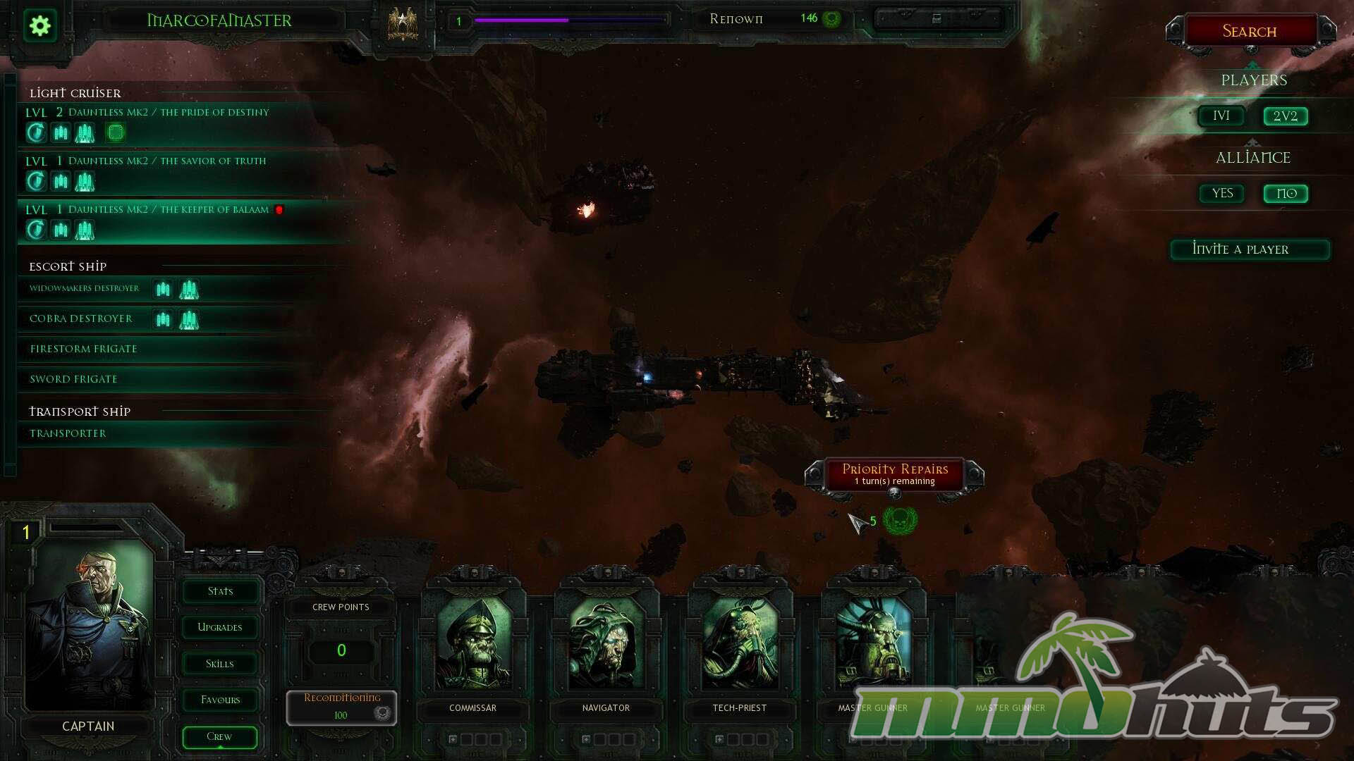 | Publisher: Focus Home Interactive Playerbase: Low Type: 3D MMORTS Release Date: April 22, 2016 PvP: 1v1/2v2 Instanced Matches Pros: +Striking comic-inspired presentation and strong 40K atmosphere. +Tense, tactical ship-to-ship battles. +Helpful, dedicated community for a niche RTS. Cons: -Technical issues including bugs and occasional crashes. -Faction balance can feel uneven. -Battlefields lack variety. -Matches can start to feel samey over time. |