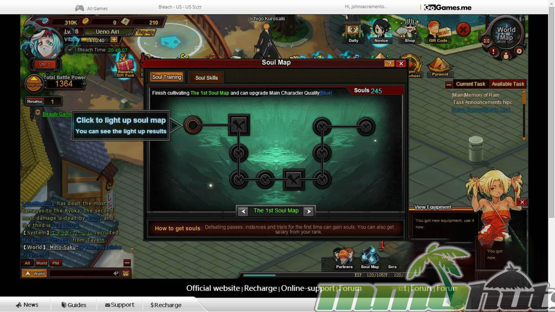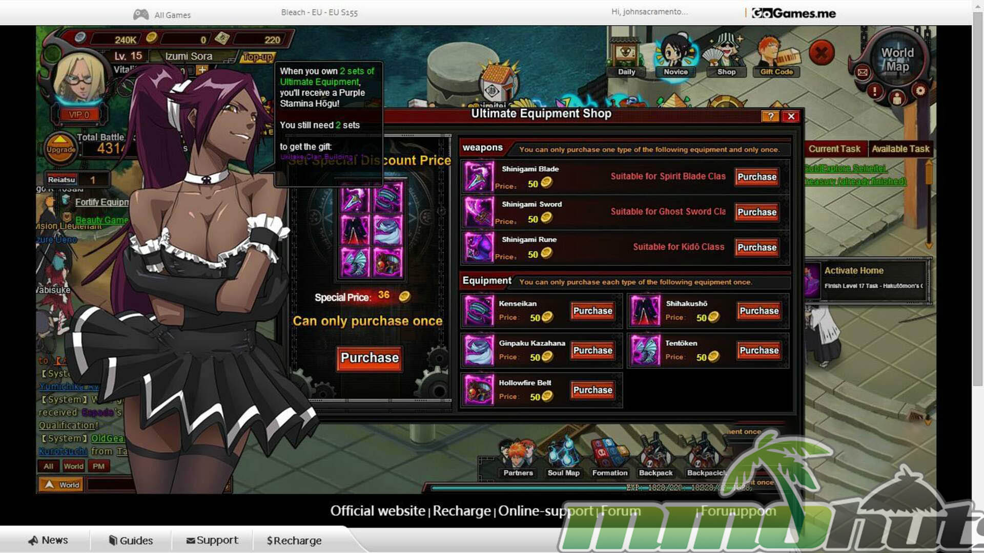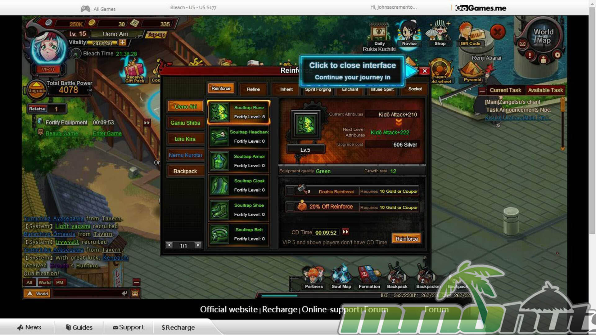 Bleach Online is a 2D fantasy browser MMORPG published by GoGames. It entered open beta on July 14, 2014, and it follows the familiar browser MMO formula of quick leveling, constant reward popups, and lots of side features that feed into your overall power score.