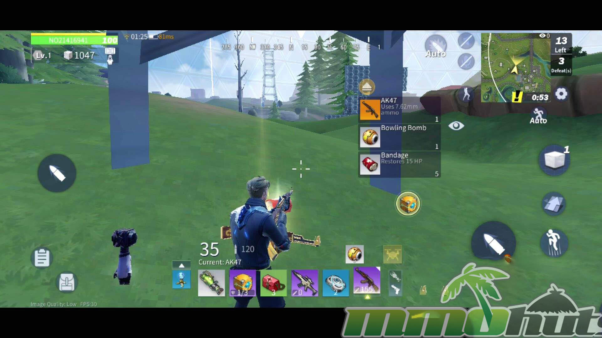 On the combat side, the game leans into variety rather than realism. Loot includes familiar categories (pistols, SMGs, shotguns, rifles, and snipers) alongside more playful options such as flamethrowers, plasma-style weapons, and a range of explosives. Gadgets like mines and the Bowling Bomb push encounters toward sudden bursts of destruction, especially when opponents are hiding behind freshly built defenses.