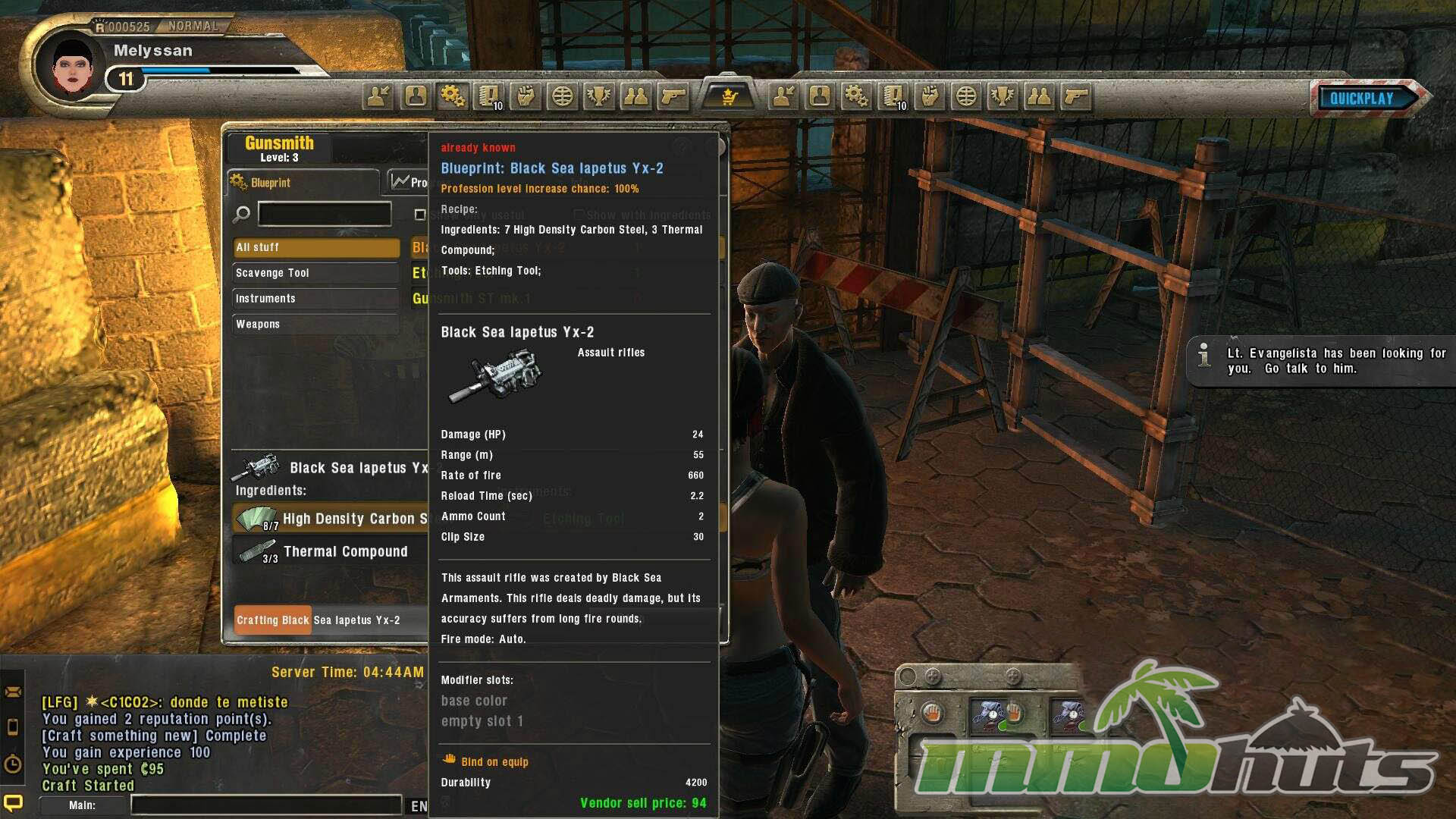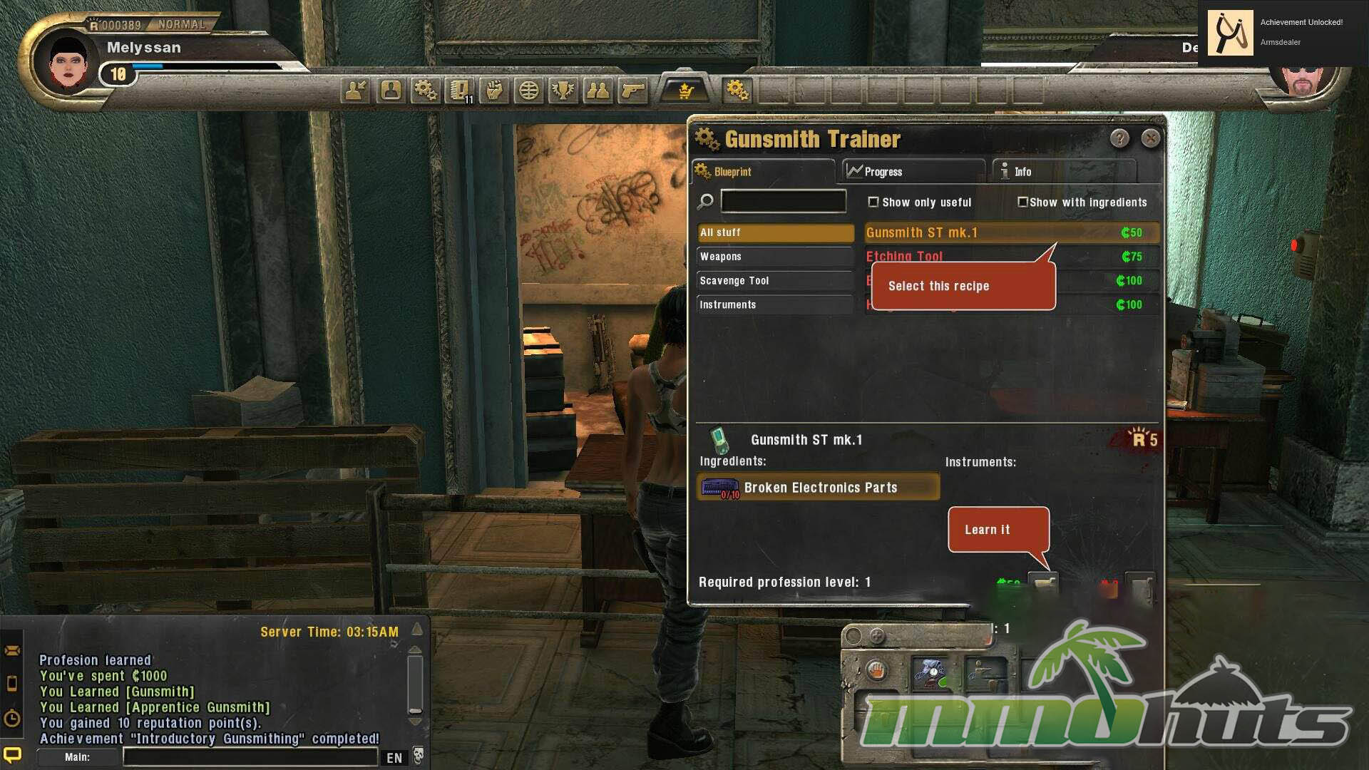 Crafting is handled through profession leveling. As you create items, your profession rank increases, and higher ranks open up more advanced recipes. It is a simple loop, but it gives the economy a purpose and provides another path to improve your loadouts beyond pure drops or purchases.