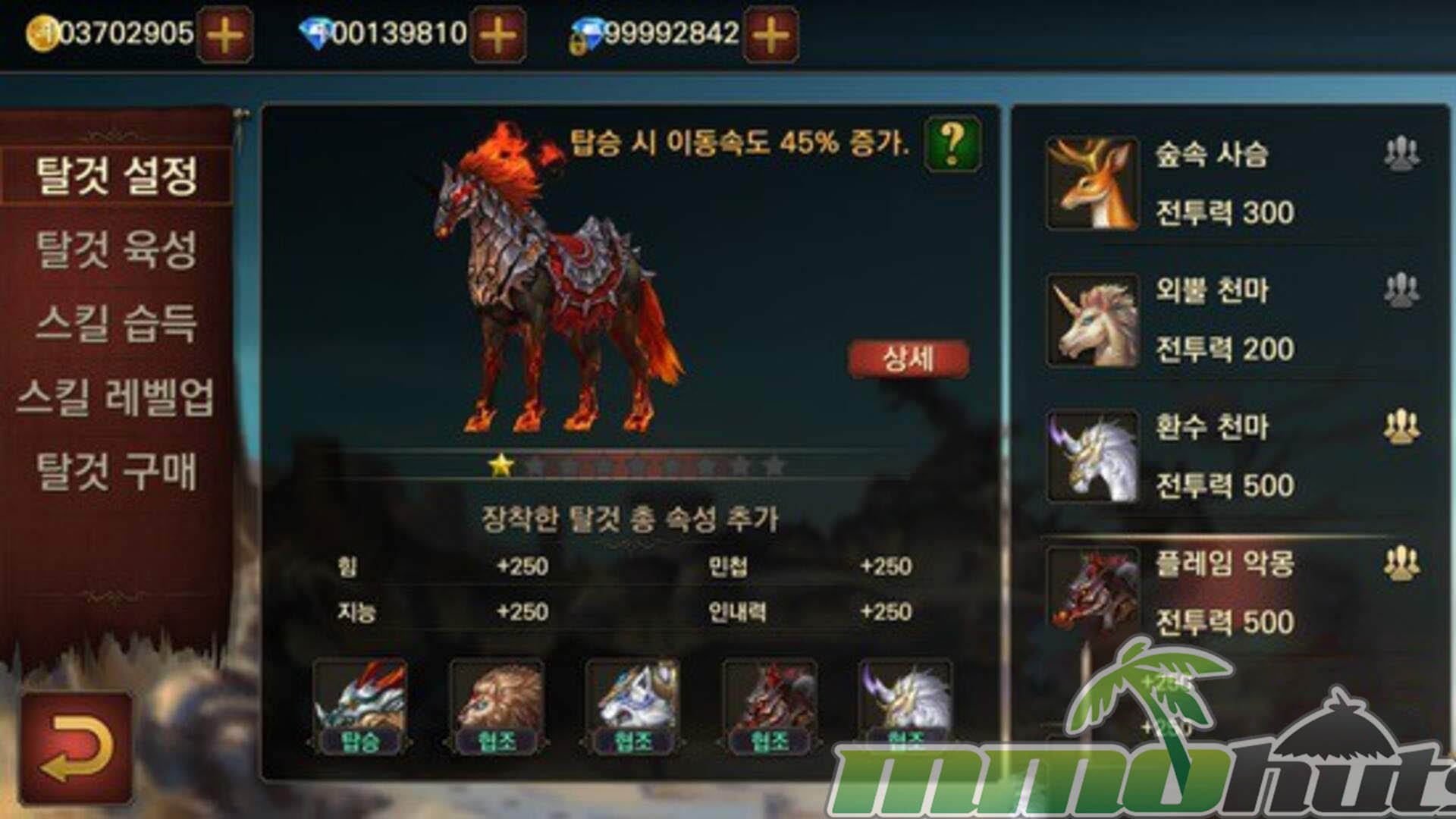 • Beastly Mounts collect mounts for faster movement, including creatures like lions, flaming horses, and dragons.