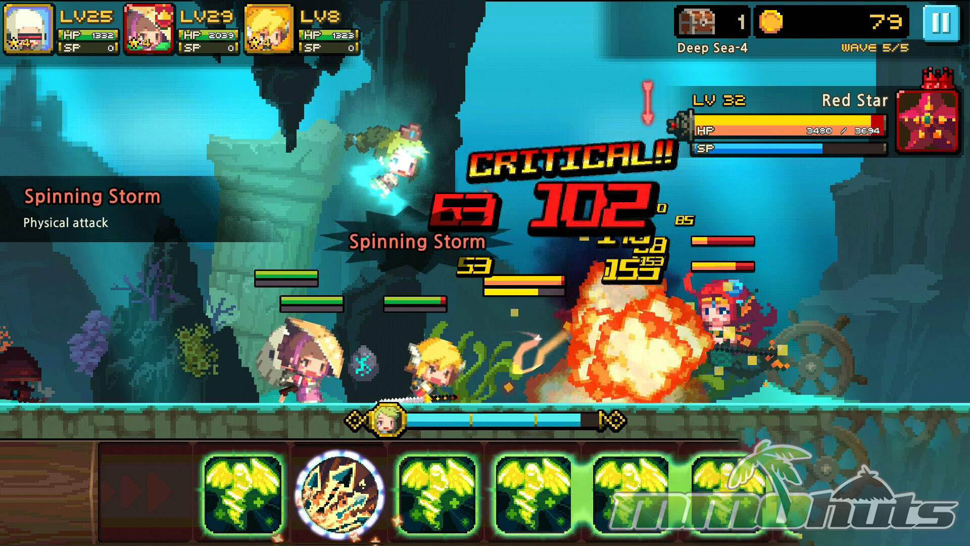 Because blocks cannot be rearranged, you often need to “spend” inconvenient blocks to reach a better chain, which adds a real-time resource management layer. Special skill blocks also appear, powered by Hero SP, and these do not require matching, they fire at full strength when used and tend to represent signature abilities.