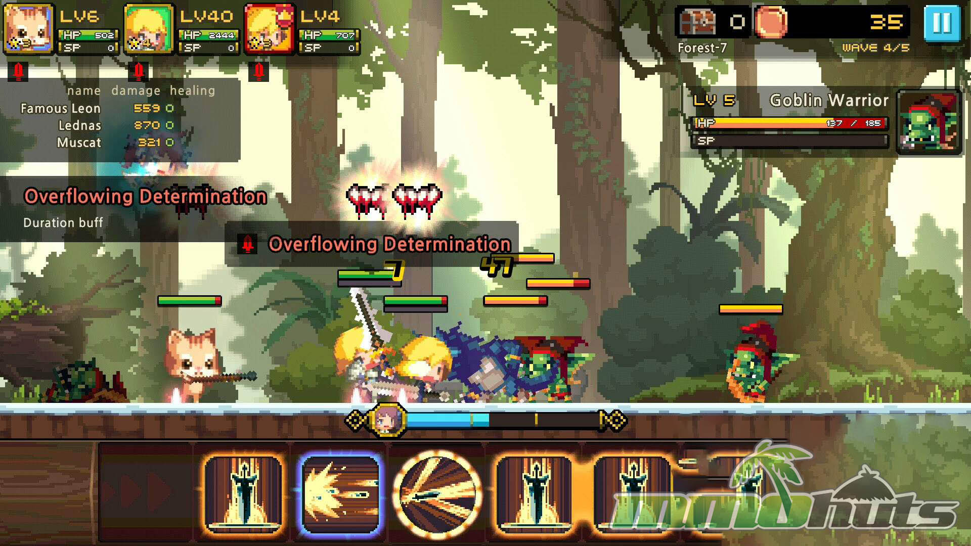 Crusaders Quest’s biggest strength at first glance is its presentation. The retro, 16-bit style is colorful and expressive, and the sprite work gives Heroes and enemies a lot of personality despite the pixel scale. Costumes and silhouettes are distinct enough that you can quickly recognize roles, from armored front-liners to robed casters, and the game leans into anime-inspired charm without becoming visually noisy.