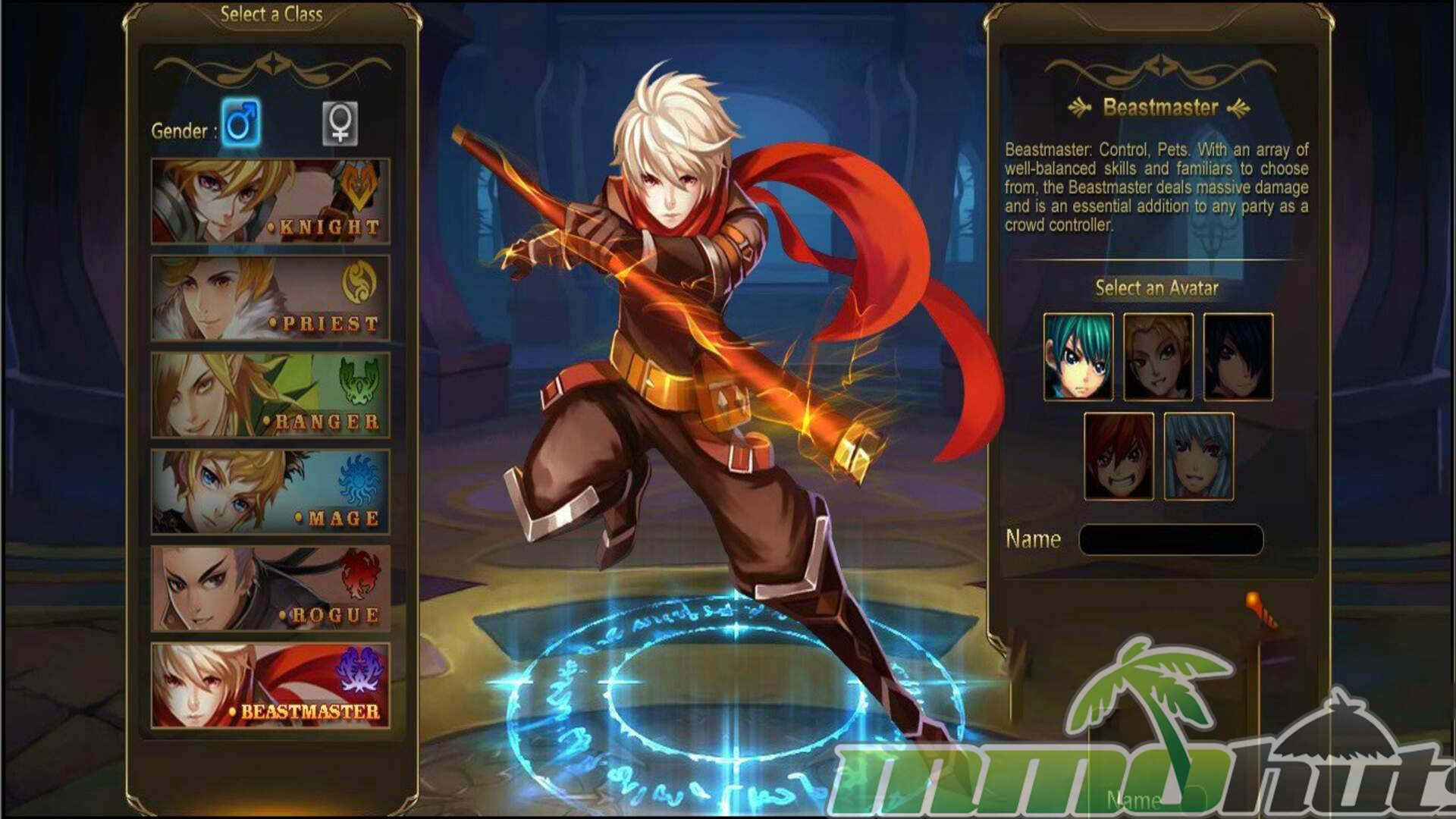 Character creation starts with one of six classes, each supported by its own skill tree and combat identity: Ranger, Knight, Rogue, Beastmaster, Mage, and Priest. The class you pick largely determines how you approach both PvE and PvP, whether you prefer straightforward frontline play, ranged damage, or a more supportive role in group content. Progression revolves around improving your equipment through Enchanting, while Synthesis lets you turn materials gathered from loot and activities into new items, reinforcing the typical upgrade loop of web MMOs.