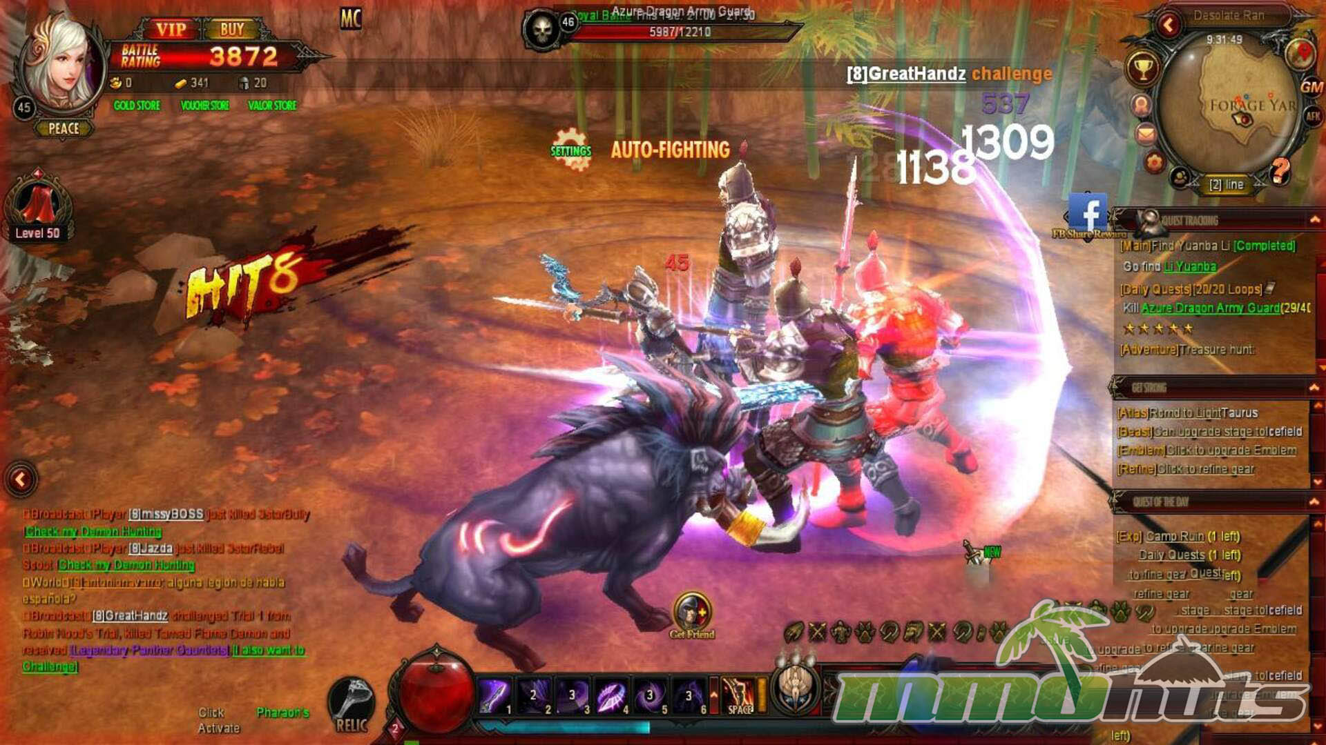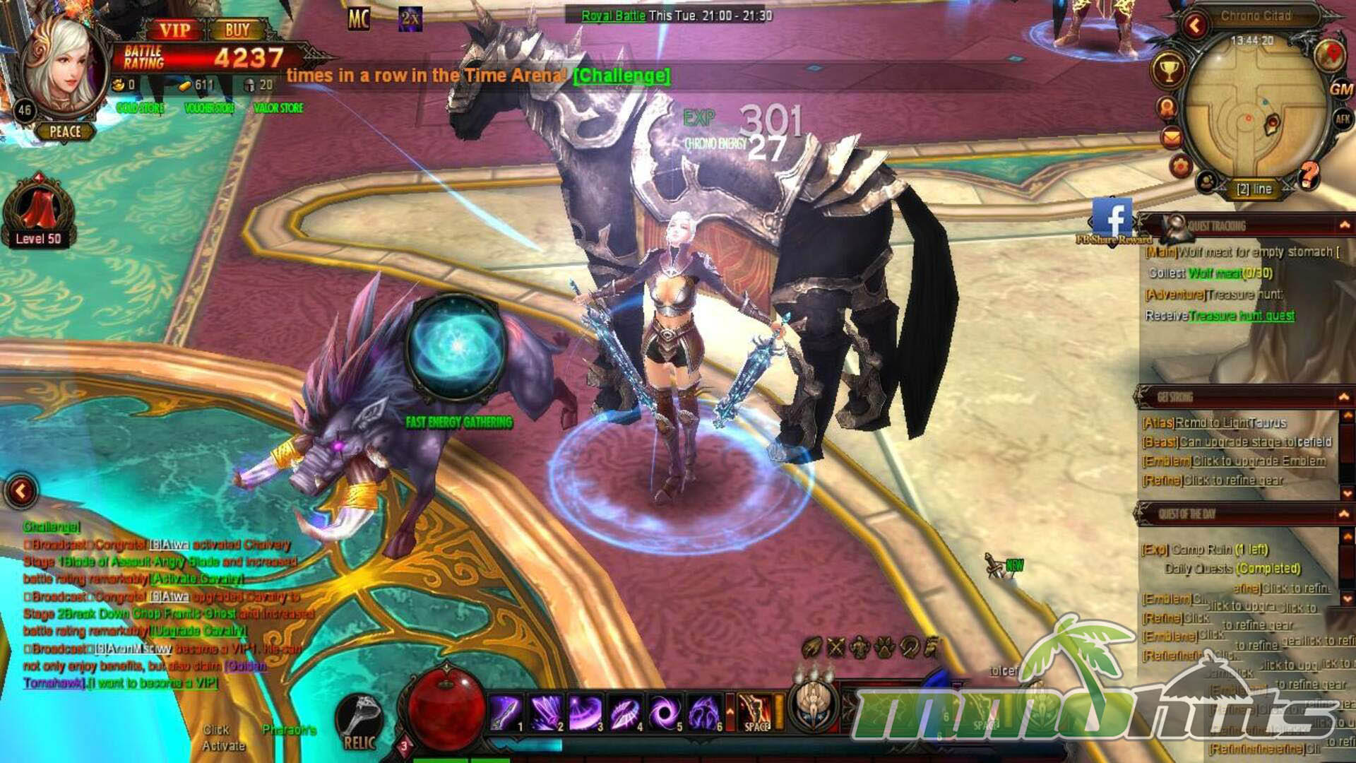Mechanically, Dark Era follows a well-worn browser MMO roadmap. Progress is guided by a quest trail that moves you from hub to hub, mixing kill counts, collection objectives, and short story beats that lead into new maps. Alongside the quest chain you unlock the expected feature set: pets and mounts, gear enhancement, crafting-style systems, instanced dungeons, boss encounters, and group-oriented activities that become more relevant as your power rises. Combat is point-and-click, and most fights revolve around pulling groups and cycling skills to clear quickly.
