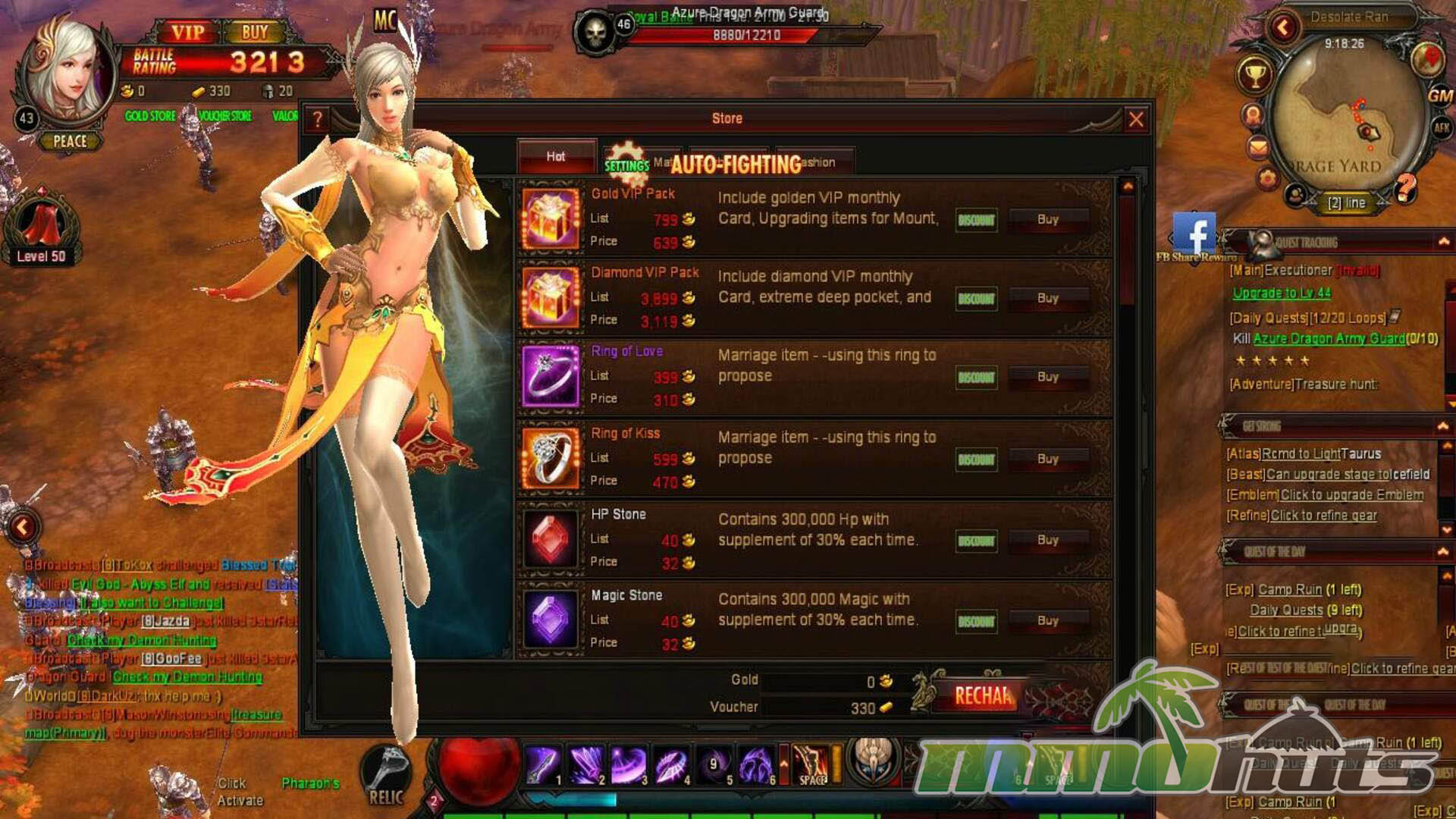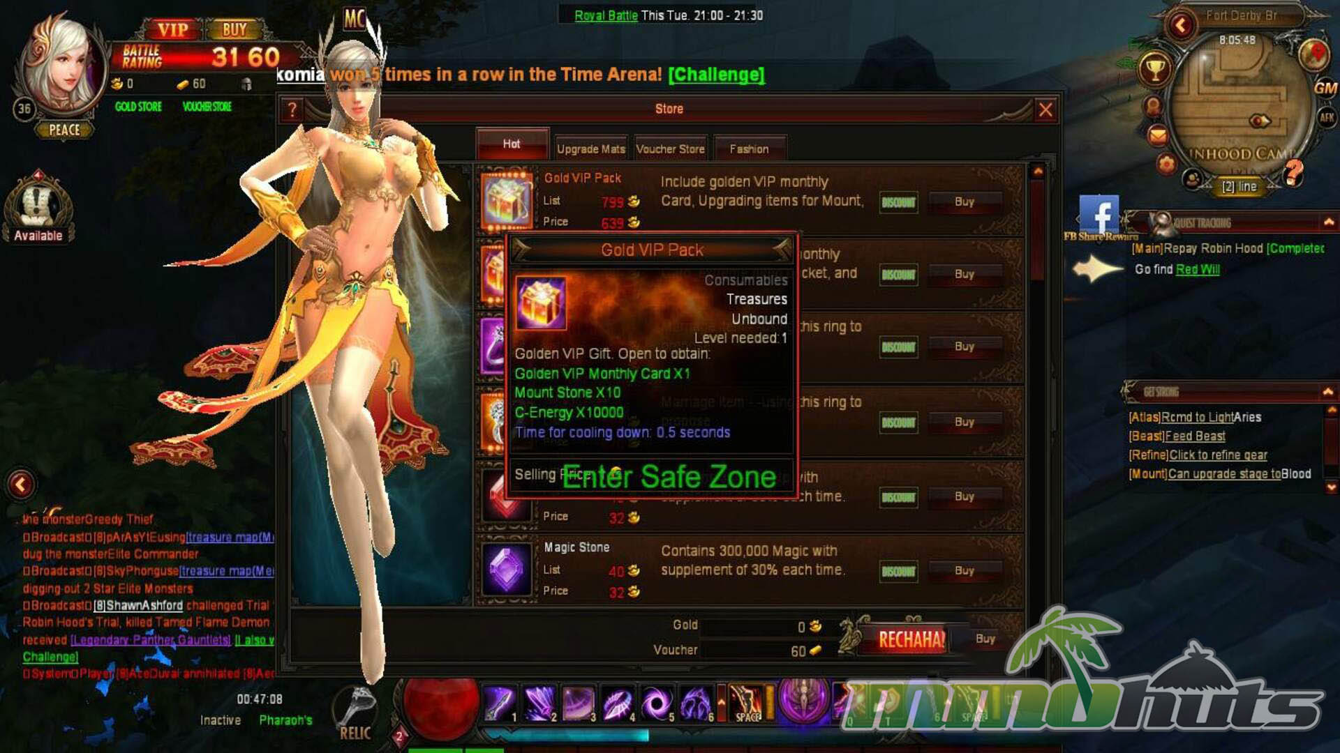 Like many free-to-play browser MMORPGs, Dark Era monetizes through a premium shop offering convenience and power-adjacent items. Expect VIP packs, boosters, weapon options, and cosmetics. Paid weapons tend to be stronger than standard alternatives, though the overall balance feels more like acceleration and advantage rather than an instant “win button.” Importantly, the game also provides vouchers from play (such as through quests), which can be used toward premium purchases. Earning enough through vouchers takes time, but it does give free players a path to selected shop items if they are willing to grind.