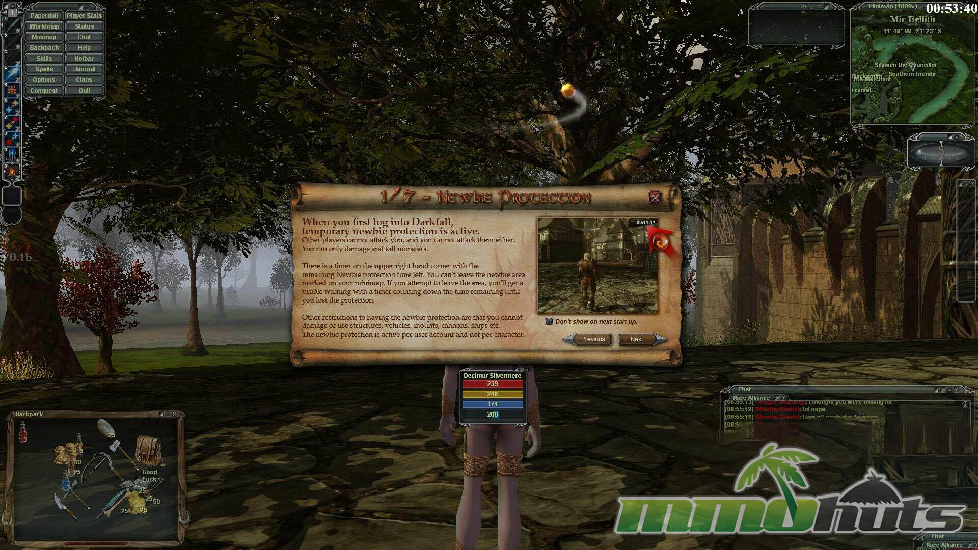 Pros: +Multiple playable races with different flavor. +Combat supports first and third person views. +Progression is driven by skills and use.