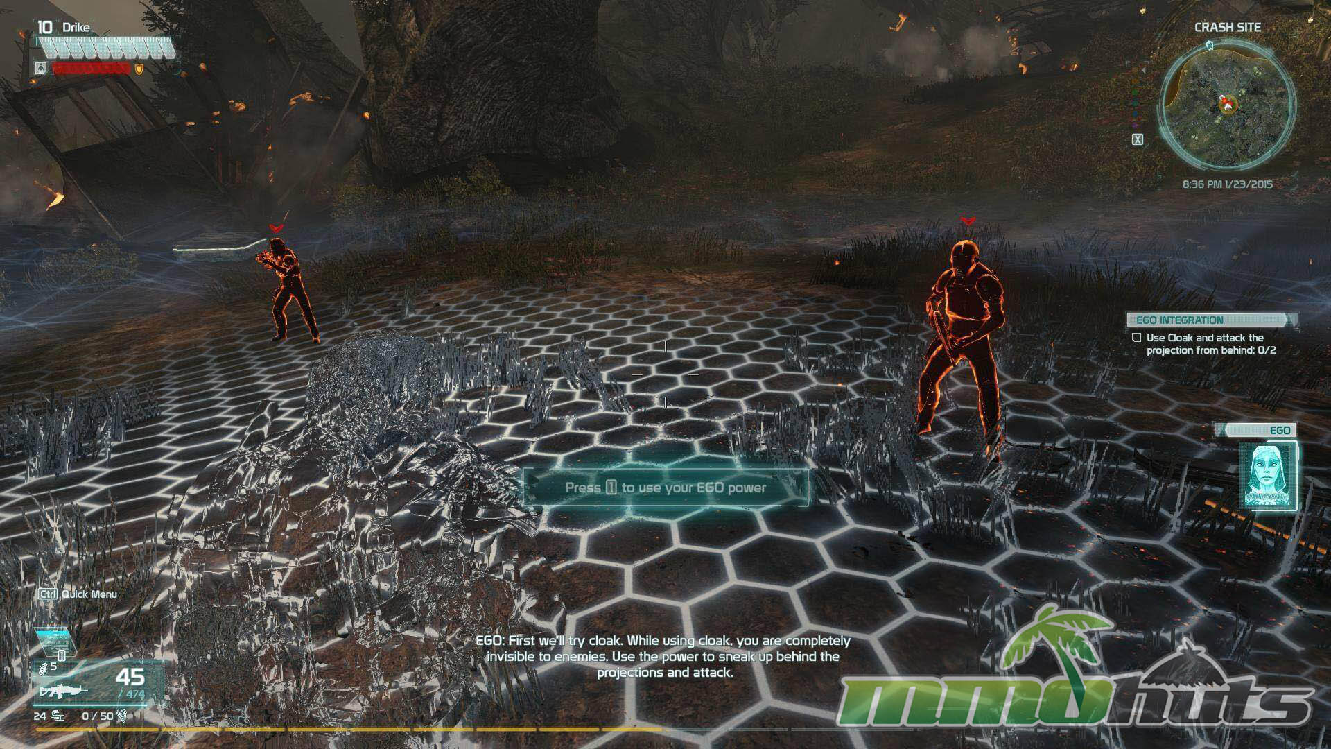 The opening hours focus on teaching fundamentals while introducing the EGO implant, represented in-game by a holographic guide. Missions are built to cover the basics, movement, swapping gear, using items, and activating EGO abilities. Controls follow familiar PC shooter conventions (WASD movement, right-click to aim, left-click to fire), and the tutorial has you try each of the four core EGO powers before committing to your first pick.