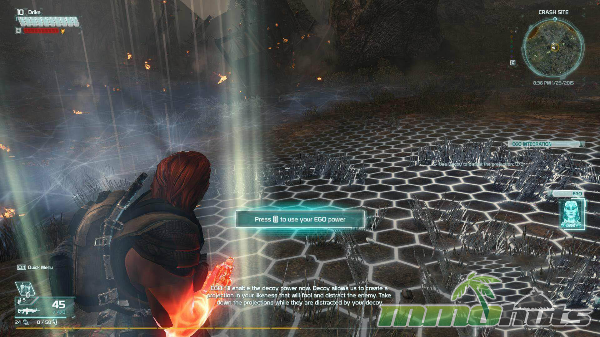 The opening hours focus on teaching fundamentals while introducing the EGO implant, represented in-game by a holographic guide. Missions are built to cover the basics, movement, swapping gear, using items, and activating EGO abilities. Controls follow familiar PC shooter conventions (WASD movement, right-click to aim, left-click to fire), and the tutorial has you try each of the four core EGO powers before committing to your first pick.
