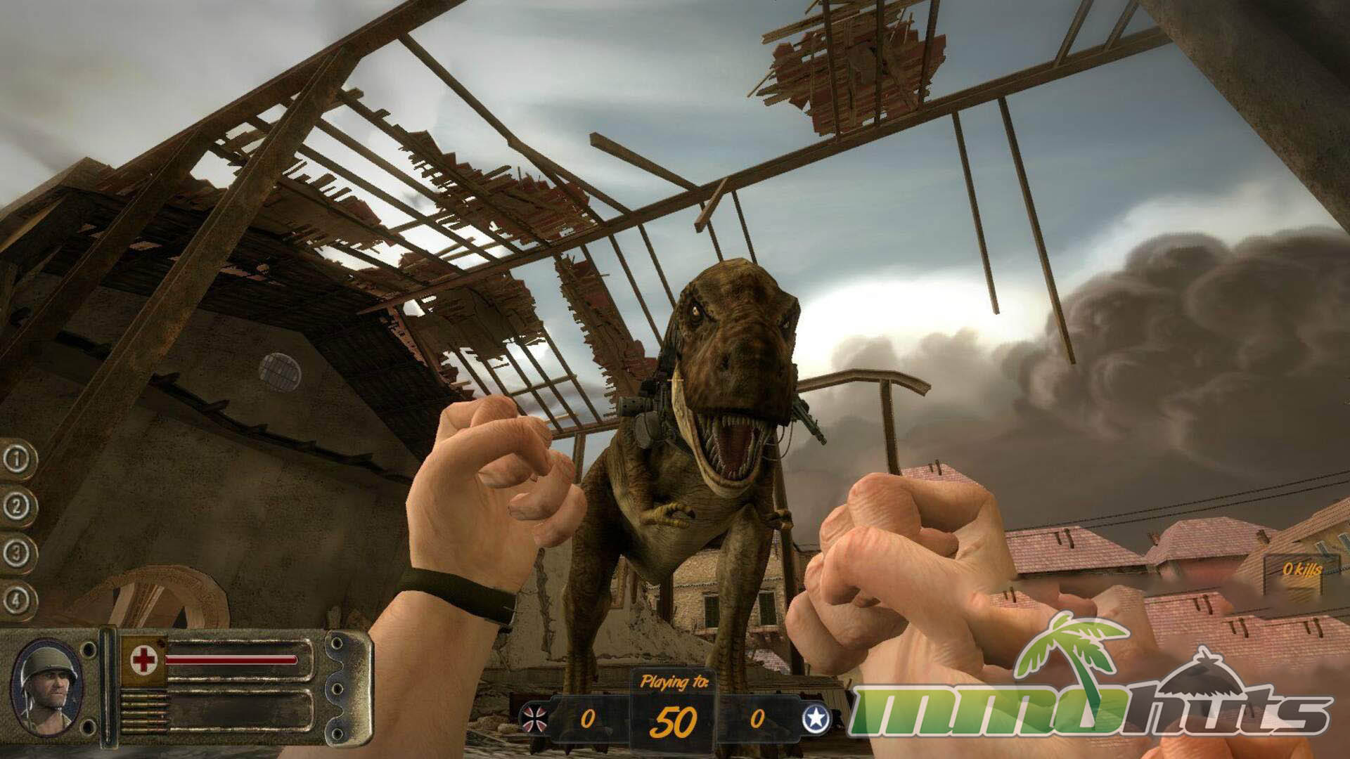 Dino D-Day is a multiplayer first-person shooter set in a pulpy alternate take on World War II, where the Axis has dinosaurs in the trenches alongside soldiers. You can fight for either side, switching between human classes and prehistoric muscle while completing objectives across several classic FPS modes.