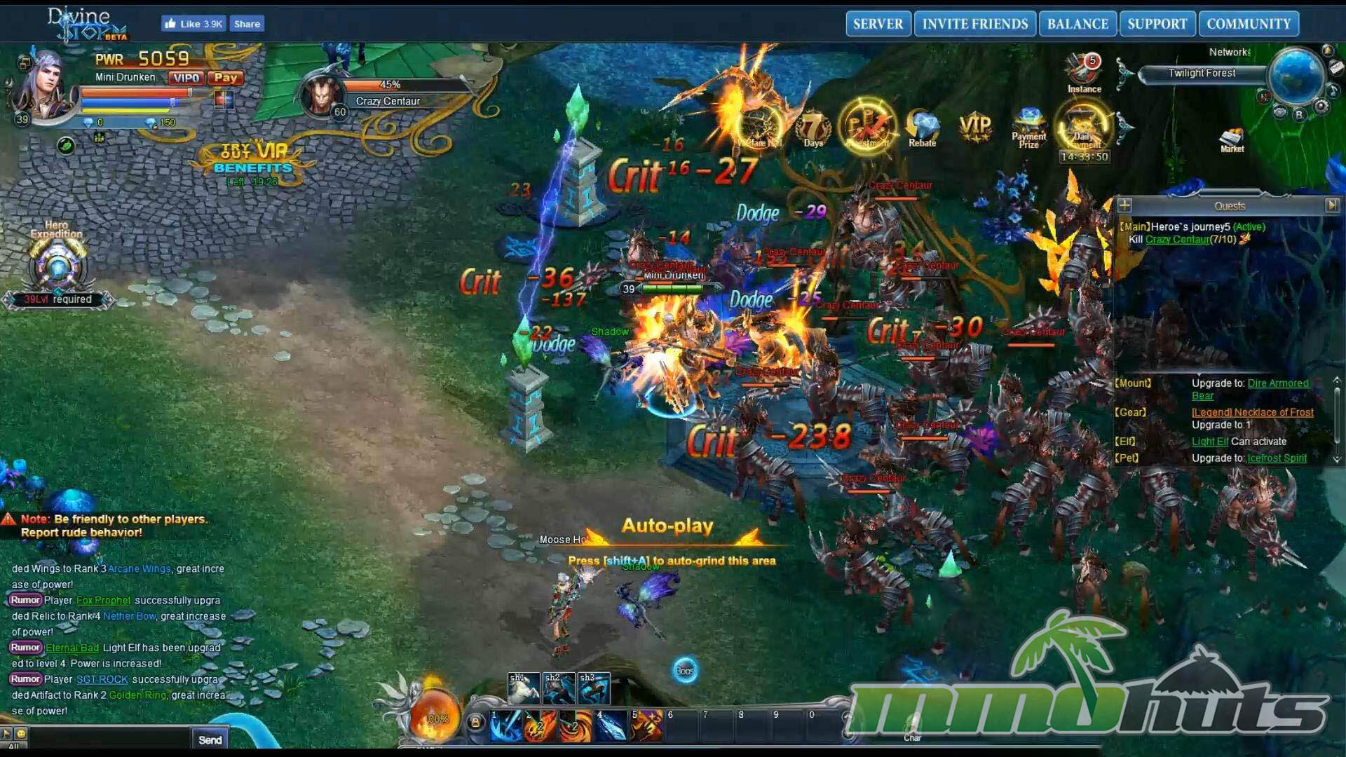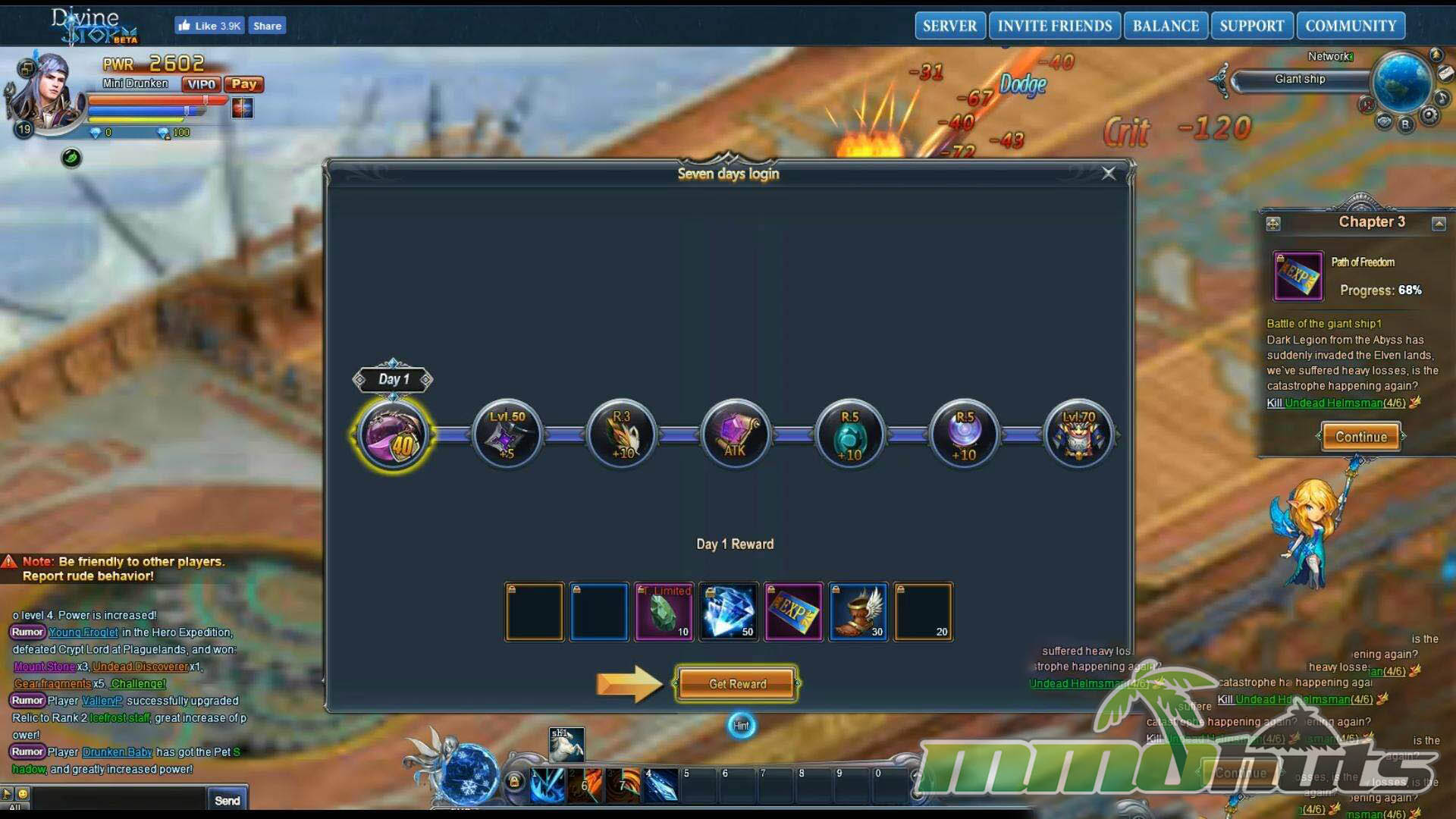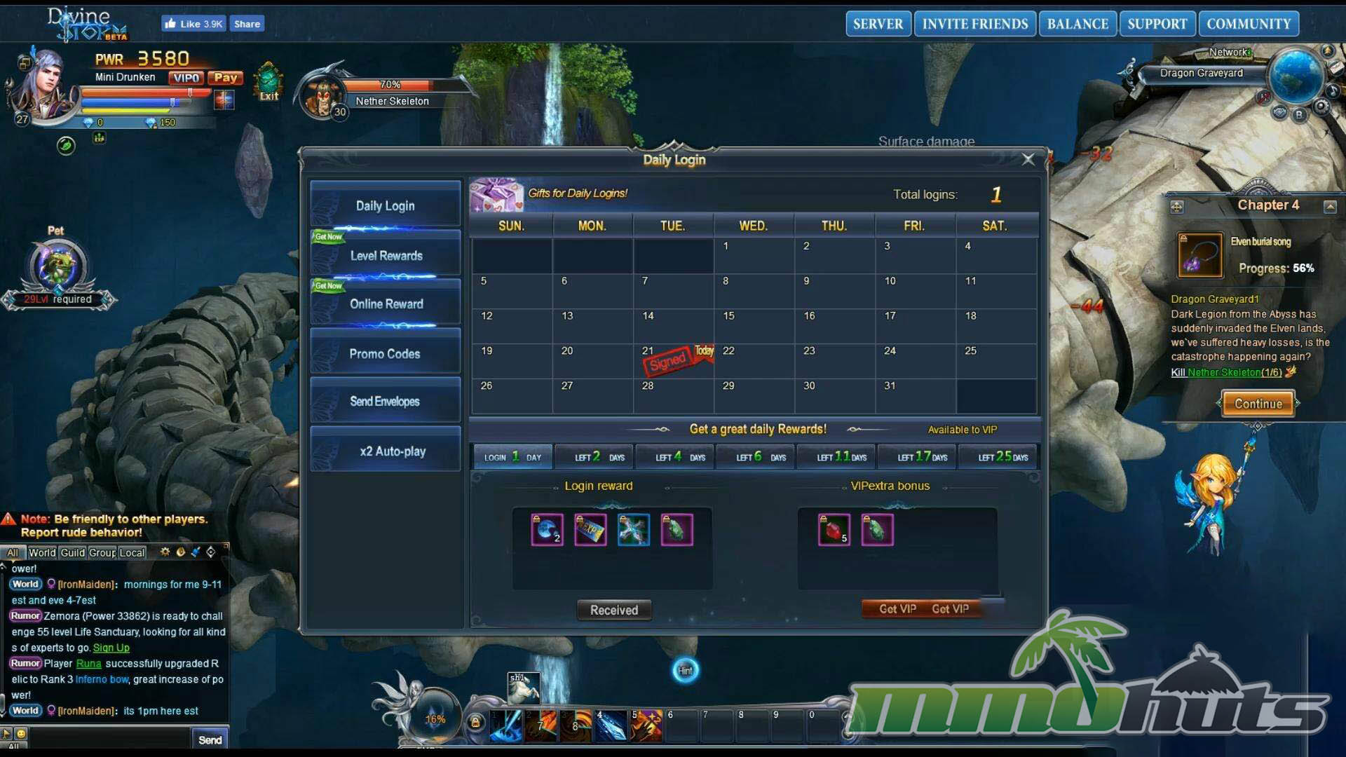 | Publisher: Infiplay Playerbase: Medium Type: Browser MMORPG Release Date: March 10, 2017 Pros: +Daily login bonuses and recurring rewards. +Regular weekly event activity. +Bright, satisfying skill visuals. Cons: -Heavy reliance on auto-play. -Noticeable pop-in on some effects. -Busy, cluttered UI layout. |
