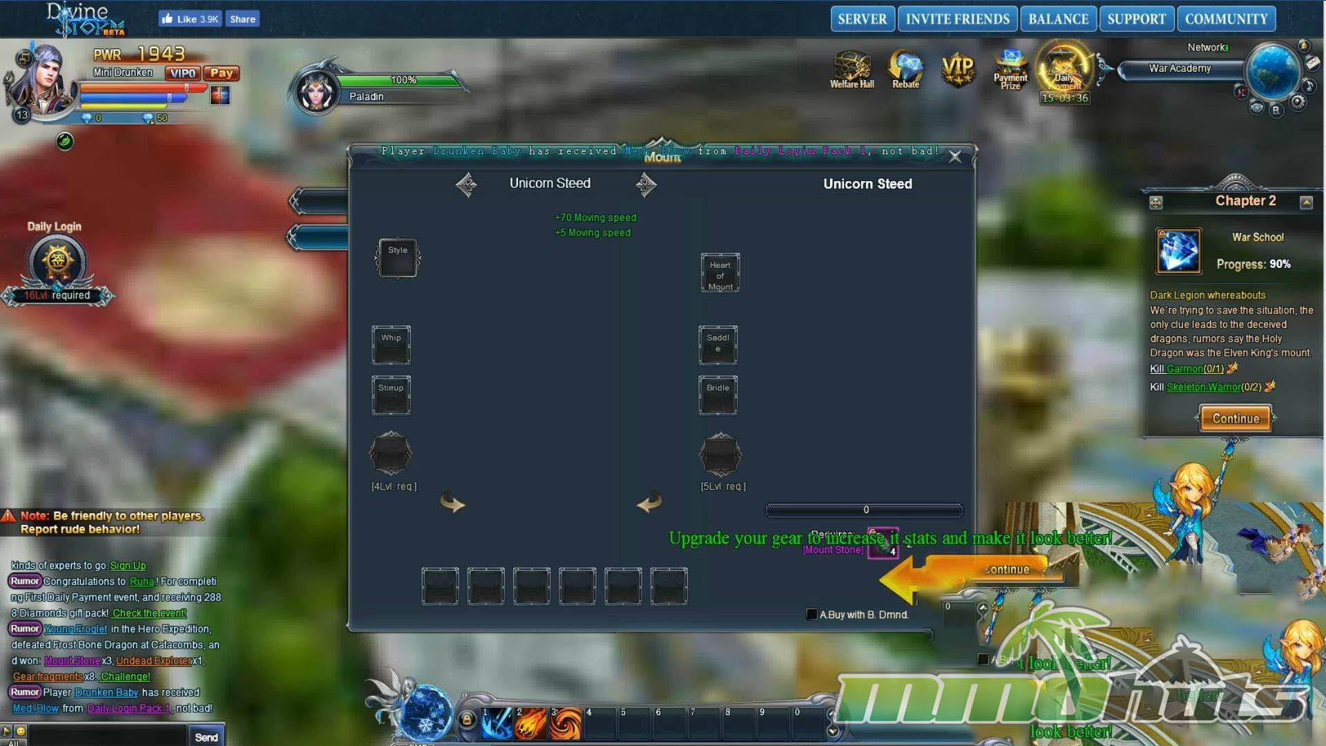 Divine Storm aims for a familiar browser MMO formula: quick access, constant rewards, and a steady stream of upgrades that push your power rating upward. From the first minutes it is clear the game prioritizes momentum. Quests chain into each other rapidly, enemies are designed to be cleared in groups, and the interface keeps multiple progression tracks in view at all times. If you enjoy games where there is always a new button to press for a reward or an upgrade, Divine Storm understands that appeal.