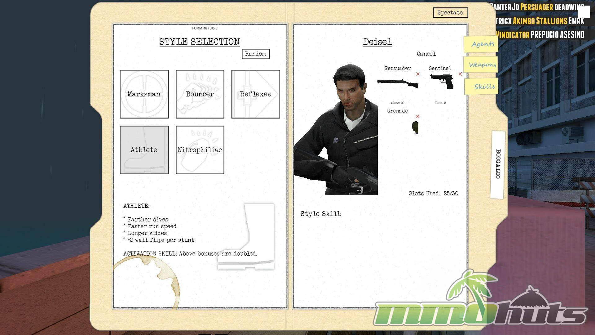 Before a match you pick an ability such as Marksman, BounceMan, Reflexes, Athlete, or Nitrophiliac. These modifiers are small but meaningful, and the right pairing can push you toward a specific role even in a free-for-all. Marksman is the obvious choice if you want cleaner recoil control and more reliable mid-range shots, while Nitrophiliac leans into explosives by boosting your grenade options and carrying capacity.