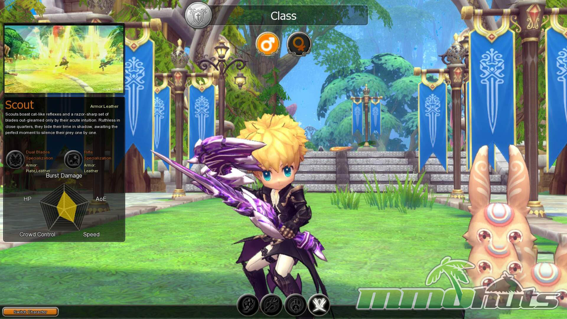 Scout – A nimble damage dealer that begins as a dual-blade melee fighter built around quick burst windows. At level 20, Scouts gain access to a cannon and can transition into a more conventional ranged DPS style.