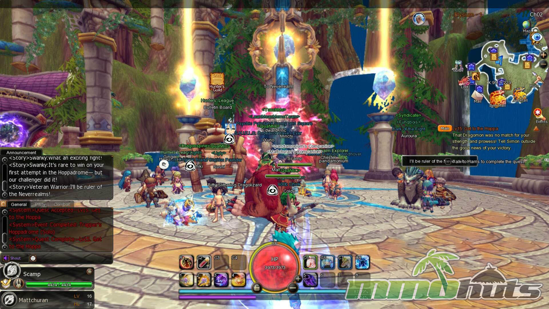 The game is built around Elysium as a central hub where you manage vendors, upgrades, and general housekeeping. From there, portals send you into mission spaces tied to quests, hunts, and guild objectives. Completing an objective frequently leads to an immediate prompt to return to the hub, so the rhythm becomes a loop of portal in, clear a small map, then warp back.