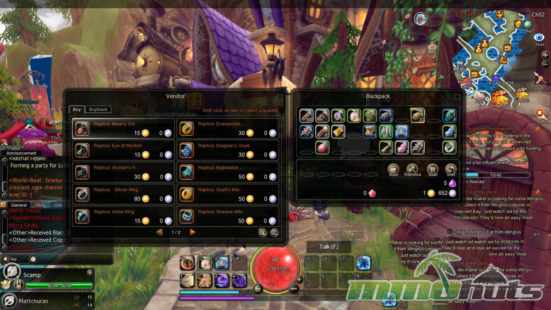 The game is built around Elysium as a central hub where you manage vendors, upgrades, and general housekeeping. From there, portals send you into mission spaces tied to quests, hunts, and guild objectives. Completing an objective frequently leads to an immediate prompt to return to the hub, so the rhythm becomes a loop of portal in, clear a small map, then warp back.