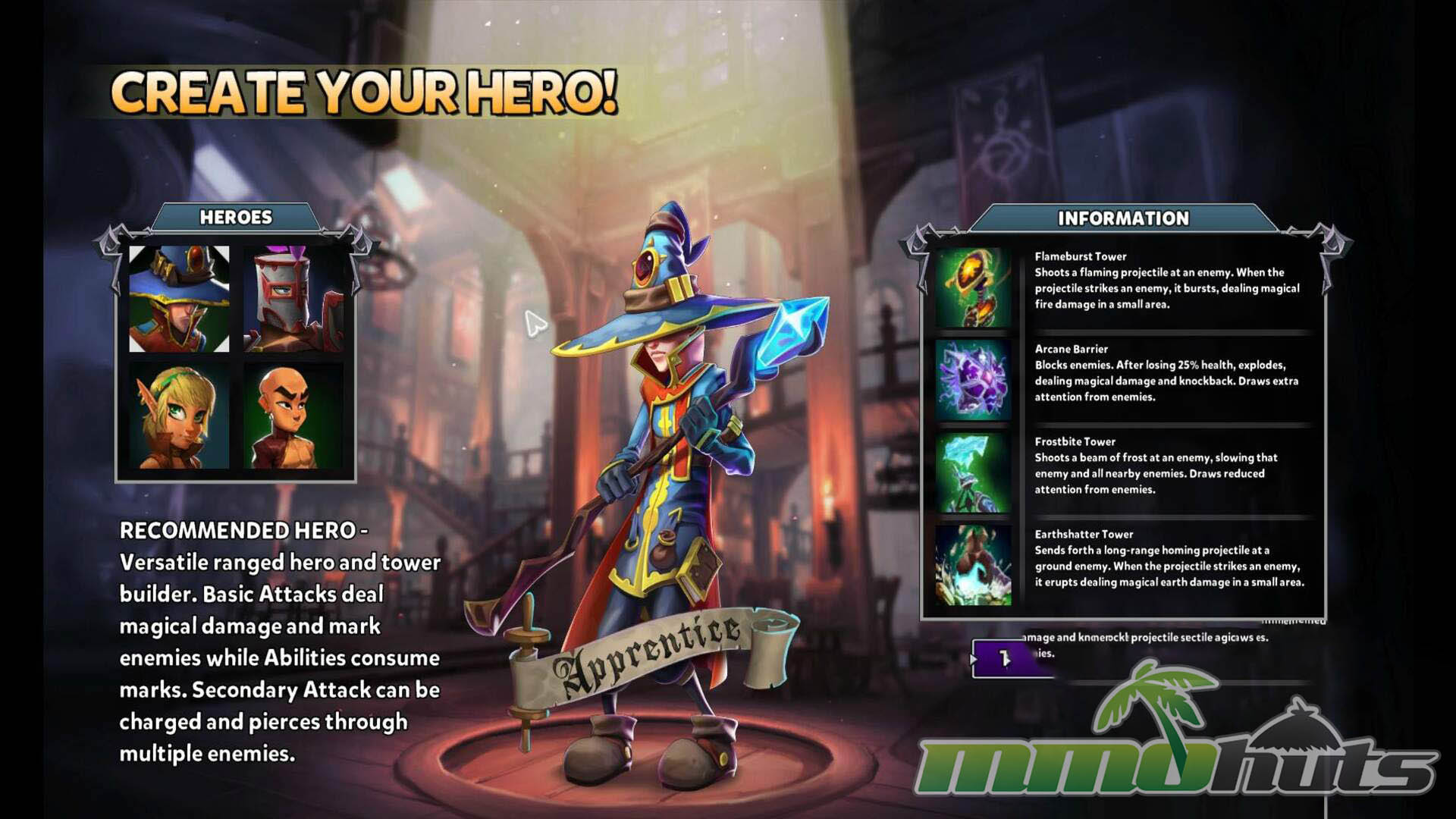 Apprentice – a ranged caster built for controlling groups, with a flexible set of towers that make him a comfortable pick in solo runs and coordinated teams.