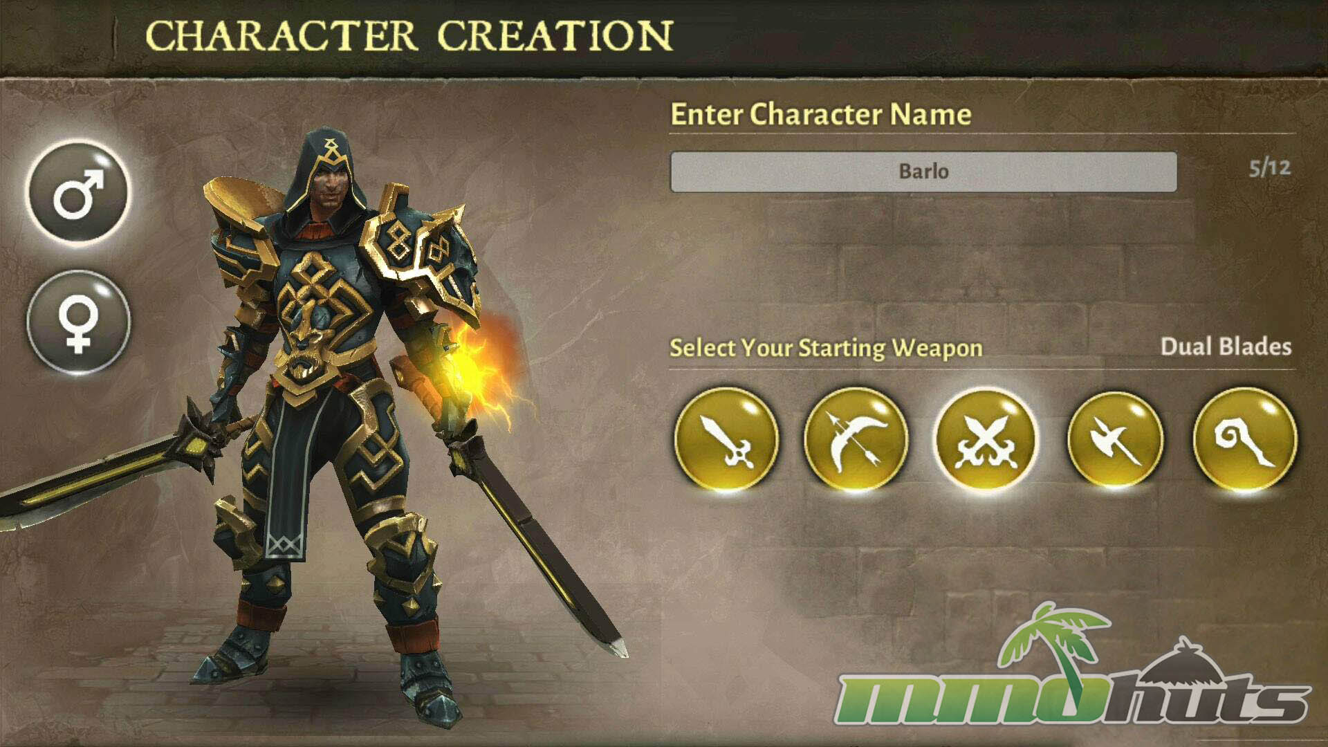 Rather than locking you into a rigid class, Dungeon Hunter 5 ties playstyle to the weapon you equip. Early on you choose from five options, a heavy greatsword, dual crossbows for ranged pressure, dual blades for speed, a sweeping glaive for reach, or a staff for magical attacks. That first pick mainly sets your starting kit, since you can freely switch “classes” later by equipping a different weapon type.