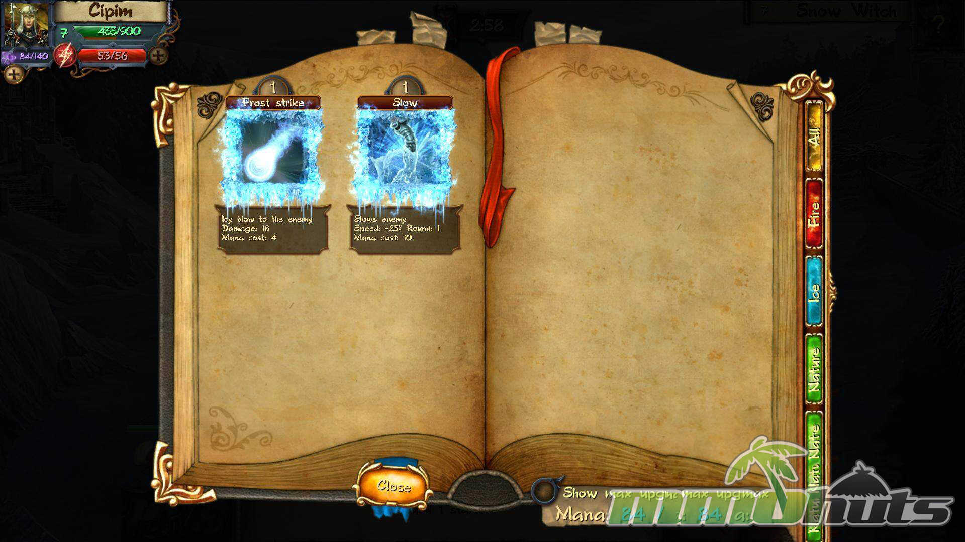Combat is built around positioning and matchups. Encounters take place on a hexagonal grid where flanking angles, ability ranges, and elemental strengths matter as much as raw stats. Alongside your units, you also maintain a spellbook tied to your element, giving you access to offensive and control-oriented magic that can swing fights when timed well. Progression comes from leveling, acquiring new spells, and improving both units and spell power through upgrades.