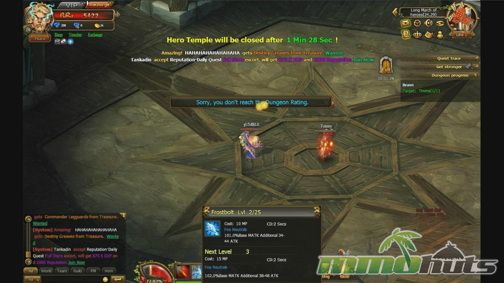 | Publisher: AMZGame Playerbase: Low Type: Browser MMORPG Release Date: November 12, 2015 Shut Down Date: November 25, 2016 Pros: +Bright, colorful presentation. +Straightforward interface. +Plenty of dungeon content. Cons: -Only a few class choices. -Heavily hands-off, automated progression. -Very familiar, WoW-like themes and naming. -Pay-to-win pressure. |