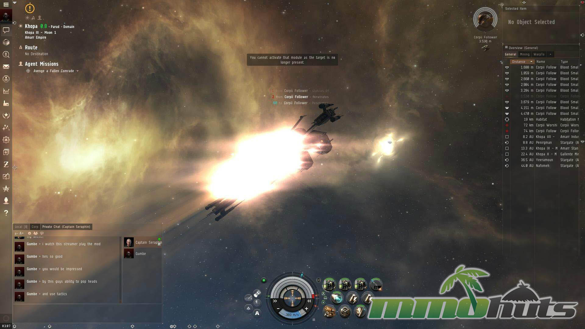 Enemies appear in the Overview, and targeting is handled through the UI, either by interacting with the list or selecting objects in space. Once locked, you trigger modules and weapons via on-screen controls or hotkeys. The pacing can feel deliberate, but in organized fights it becomes intensely tactical, with decisions made in advance and executed under pressure.