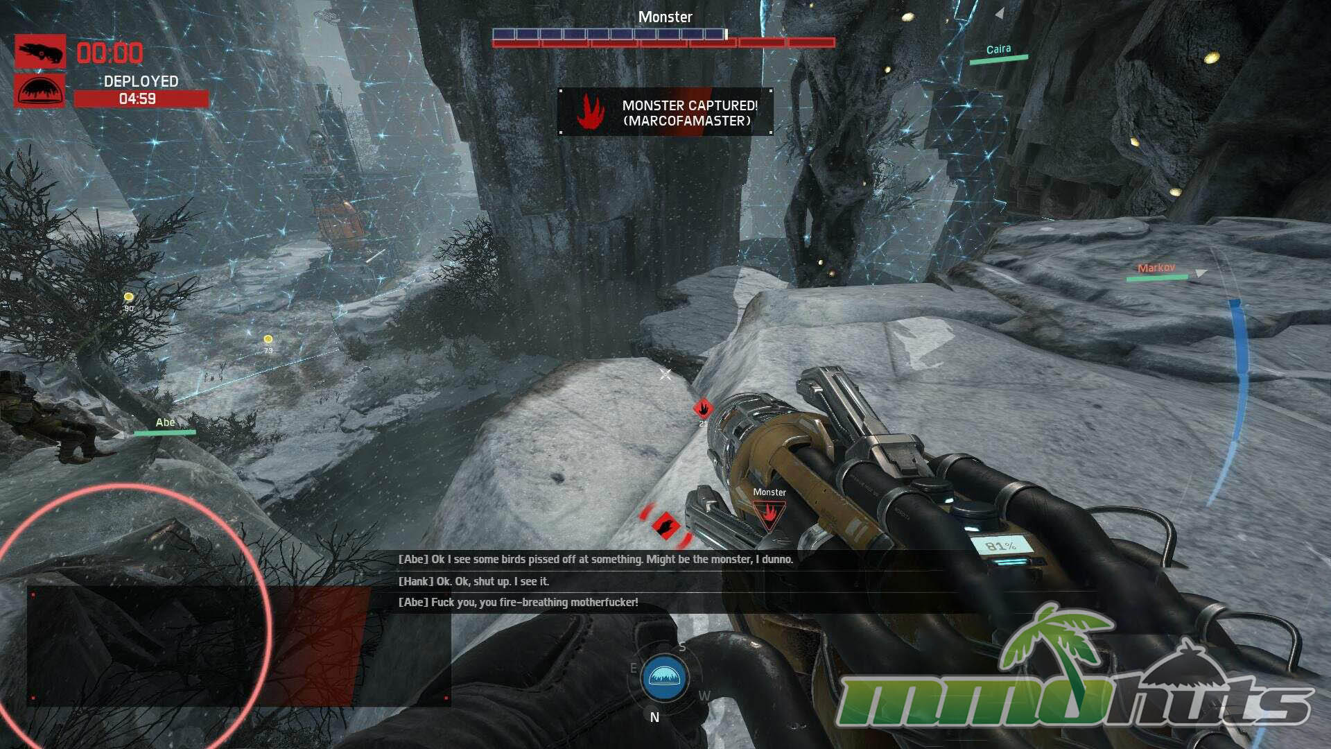 The Monster side is played in third-person, which fits the role by improving spatial awareness during chases and brawls. Monster choices range from heavy bruisers like Goliath to more elusive picks like Wraith, and each one encourages a different approach to movement and engagements. The key early-game concept is restraint: the Monster begins relatively vulnerable and needs to feed on wildlife to evolve, gain power, and recover resources. Eating is not just for growth, it also helps sustain you through chip damage and failed escapes.