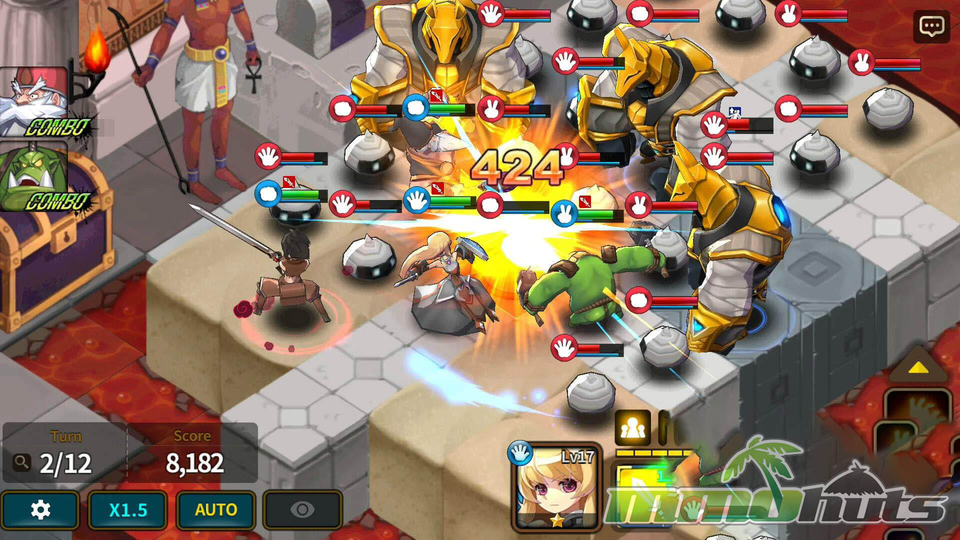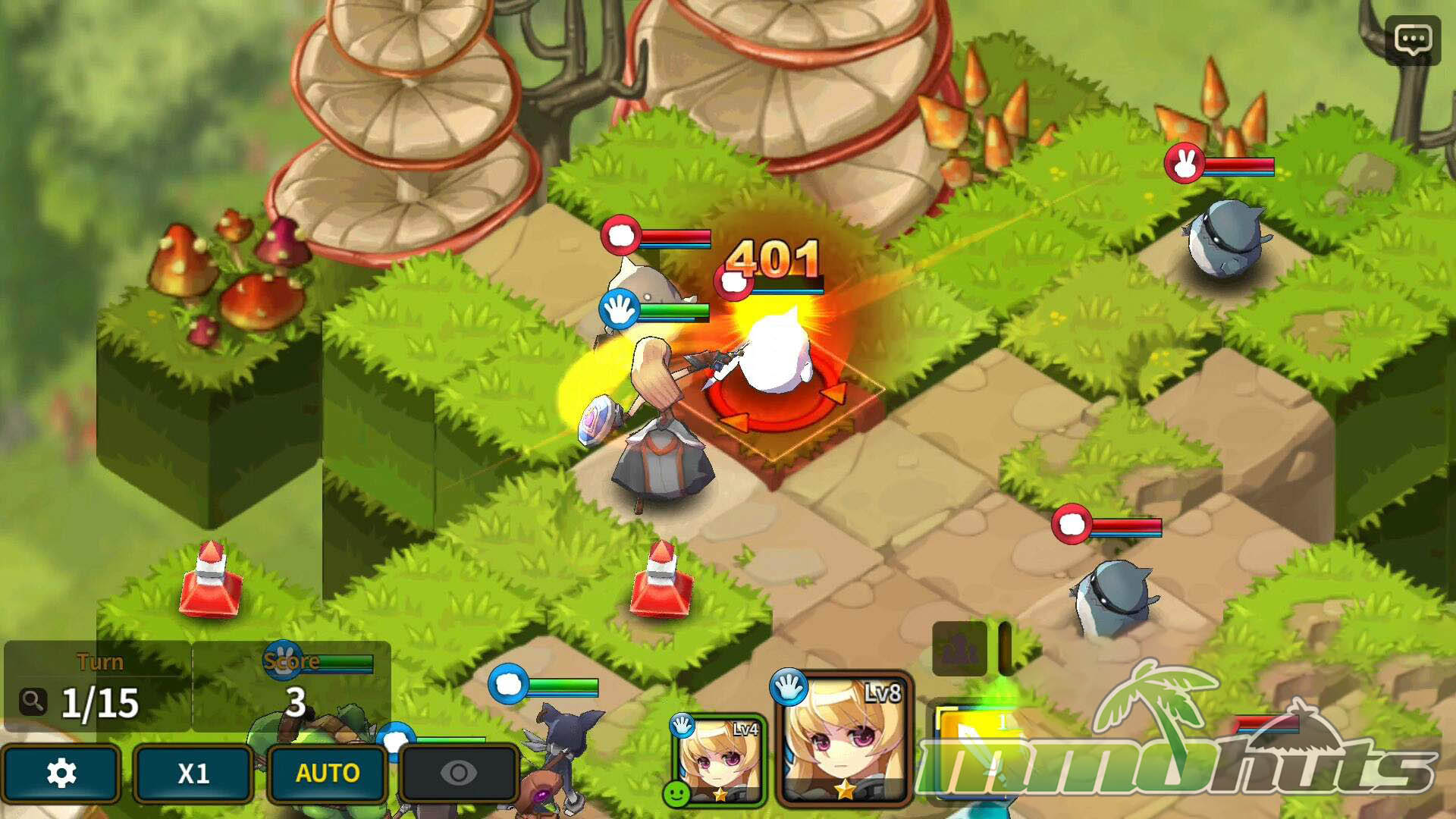 A standout mechanic is the way multiple Heroes can join in when targets are positioned correctly, allowing coordinated attacks that feel satisfying when you plan them. For players who want faster progression, there is an Auto option that handles actions for you. The AI is serviceable for routine clearing, but manual play is where the tactical depth actually shines.