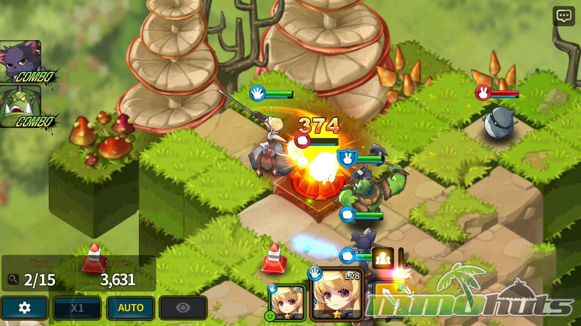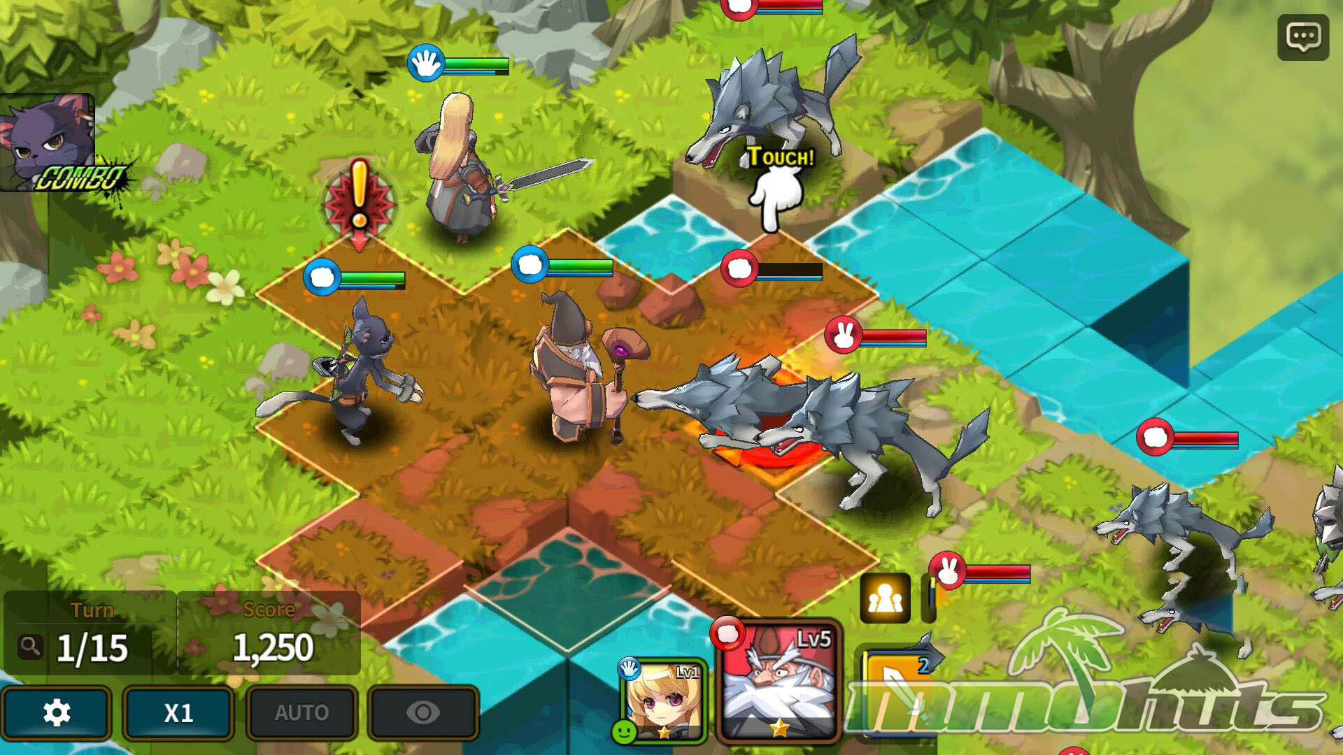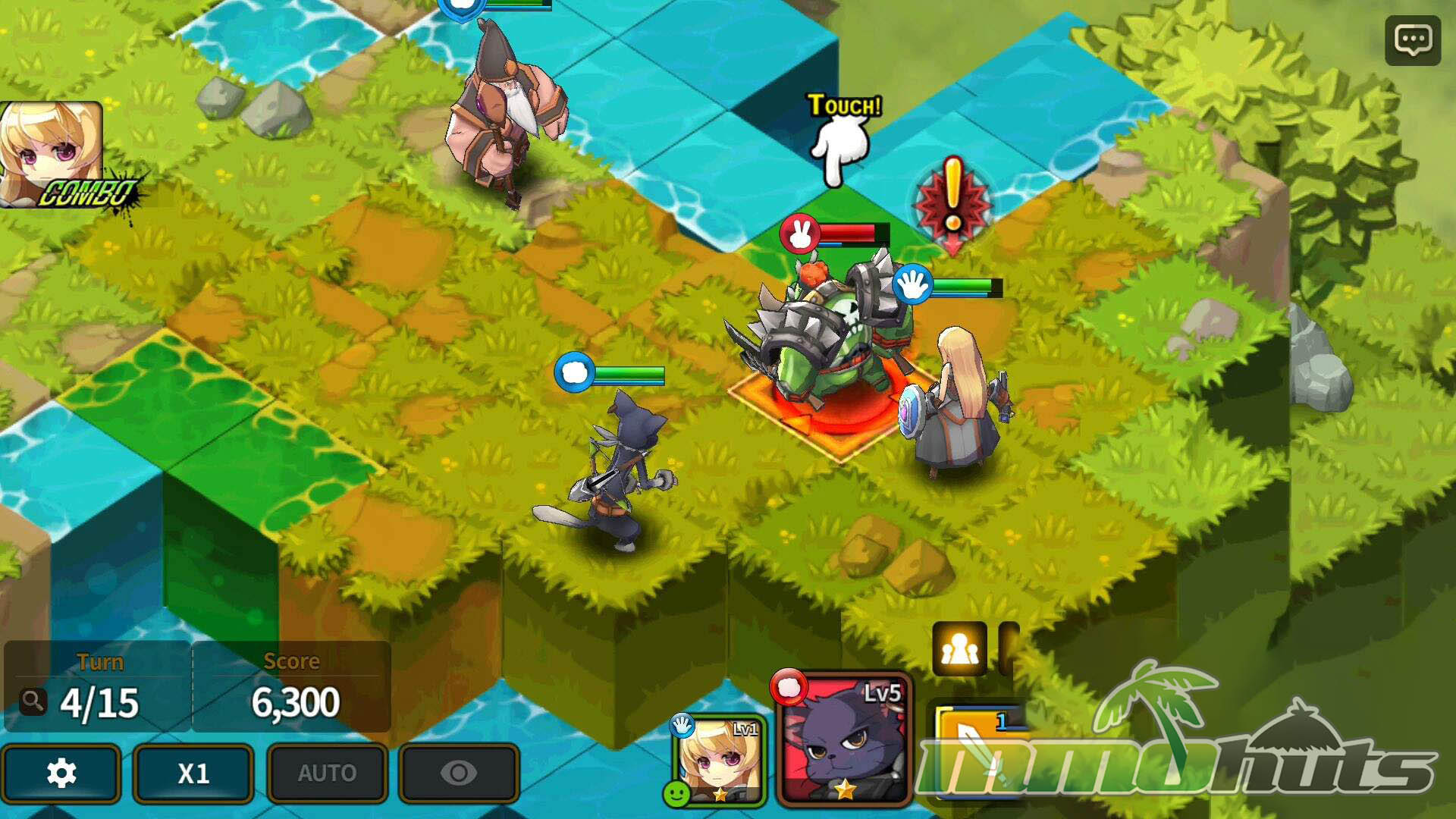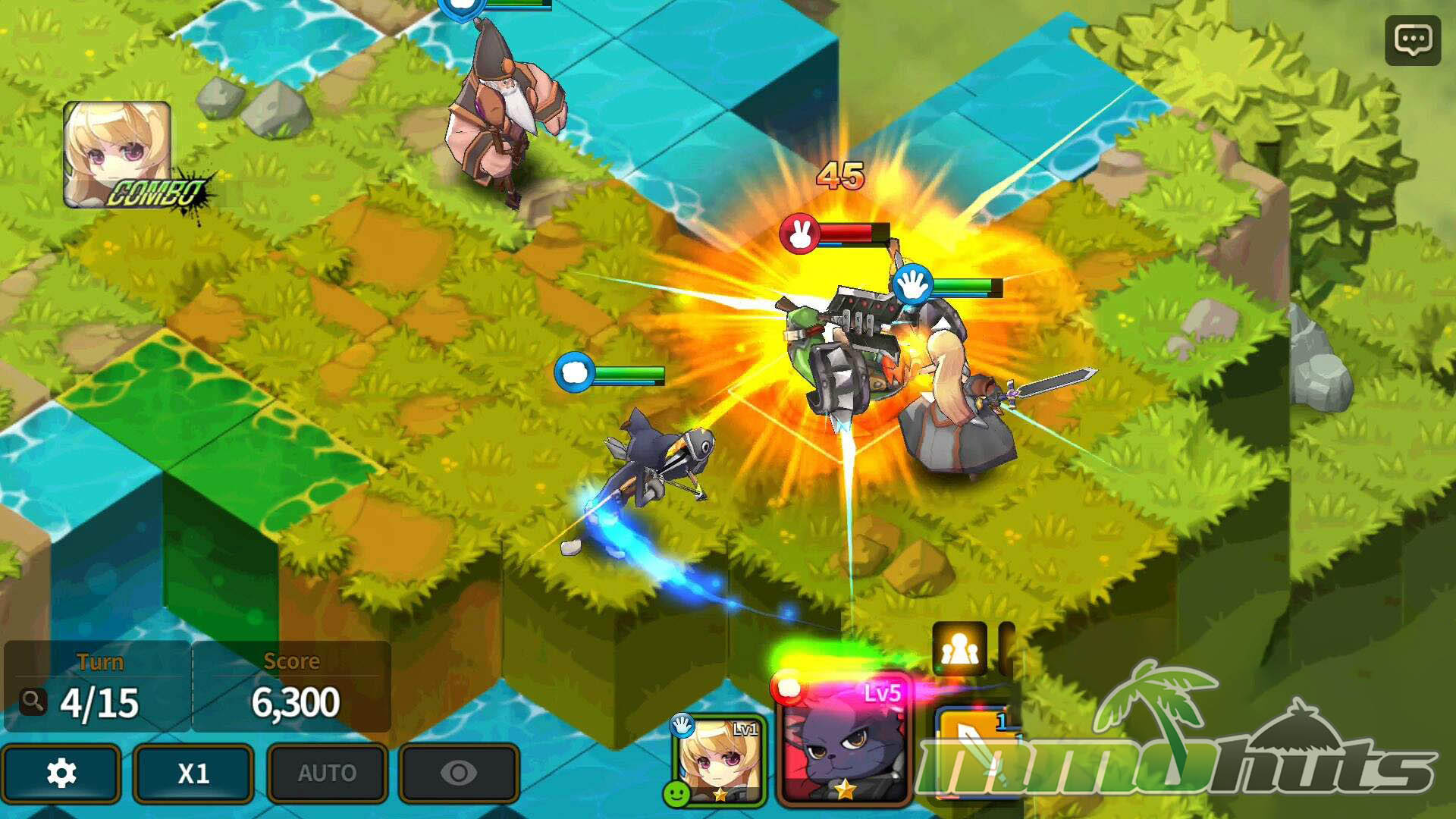 Terrain also matters. Higher ground can increase damage, and some Heroes gain additional boosts depending on specific terrain such as water, rocky areas, or grass. Attacking from behind provides extra damage, which makes flanking and careful pathing valuable, especially on maps with choke points. Certain Heroes also have cooperative bonuses when paired with specific teammates, adding another layer to party composition. Between attack patterns, skill tile shapes, and combo opportunities, fights reward planning without becoming overly complex to operate on a phone screen.