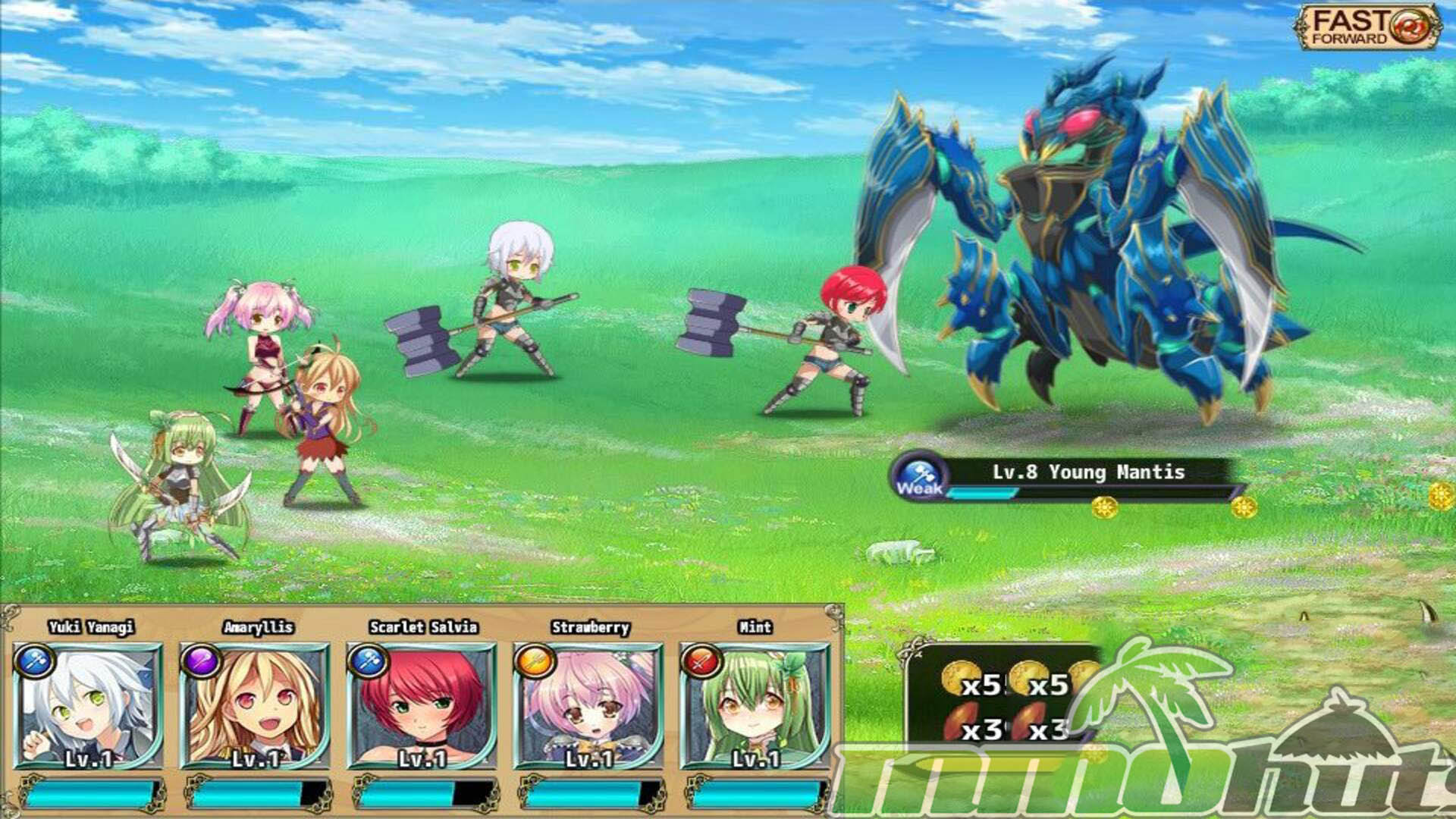 Flower Knight Girl is a free-to-play, 2D turn-based strategy RPG that ran in the browser using Flash and was playable through Nutaku’s portal. The setting is the Spring Garden, a fantasy kingdom threatened by waves of hostile insects, and your role is to command the Flower Knight Girls as their Grandmaster. Progression revolves around recruiting a large cast (over 80 characters), then arranging them into parties that can tackle story and event missions.