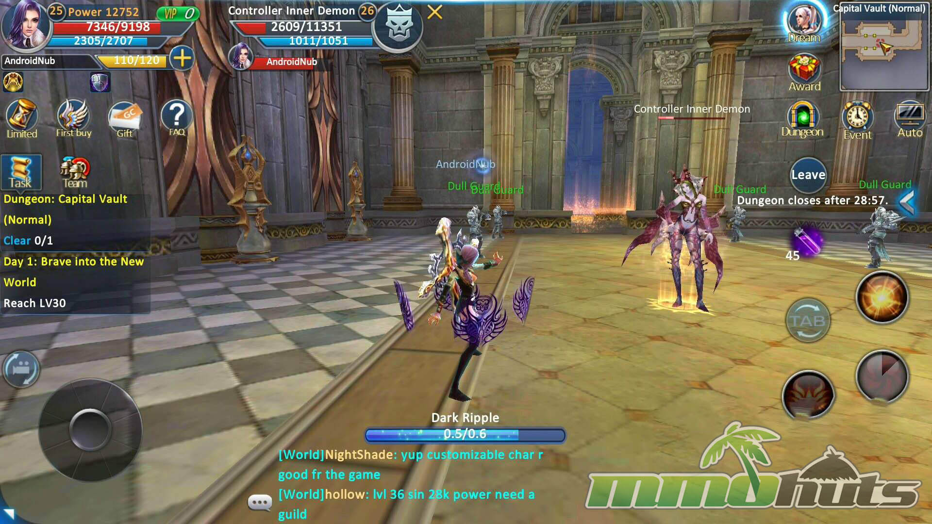 Forsaken World Mobile’s world design is one of its biggest selling points. Many mobile MMORPGs advertise “open worlds” but still rely on segmented zones and frequent transitions. Here, towns and surrounding wilderness areas connect more naturally, and you can move between populated hubs and outdoor hunting grounds without the constant stop-start feeling of loading screens. After the tutorial, you arrive in a busy city where it is immediately clear the game is built around shared spaces, with NPCs and players densely packed together.