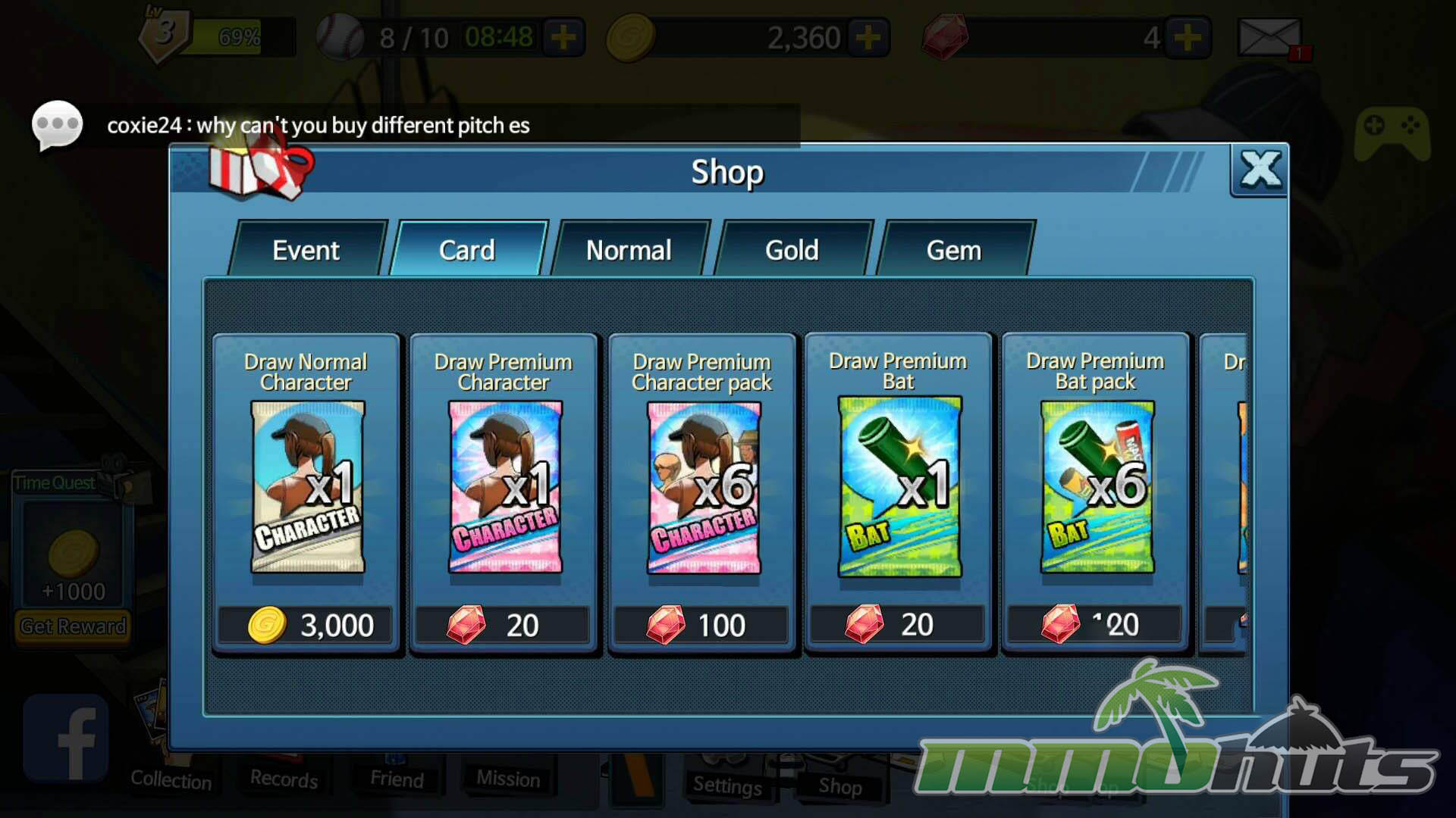 FreeStyle Baseball 2 uses a gacha-based summoning structure. Gold, the standard currency, can be used for lower-tier character summons, while Gems, the premium currency, open access to higher-tier character rolls and, importantly, to bats and catchers in the 2 to 3 star range. Since bats and catchers cannot be pulled with gold, premium currency becomes a major gateway to competitive loadouts.