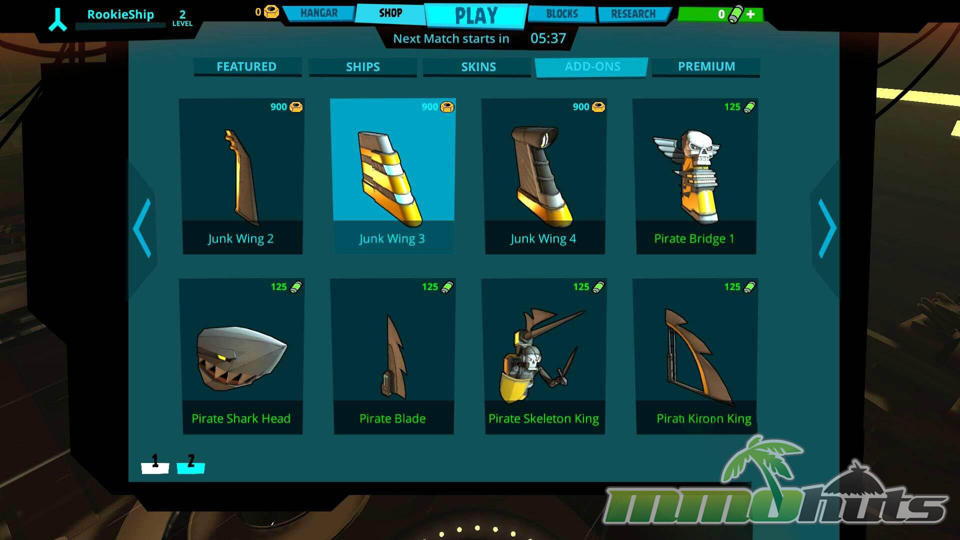 The store follows the familiar free-to-play pattern and focuses heavily on cosmetics. Most premium items are purchased with Space Credits, while some cosmetics can be obtained with Junk, the standard currency you earn through play and also use for upgrades. The shop also sells EXP and Junk boosters, and when activated they apply broadly for matches, which can feel questionable from a fairness standpoint. Overall, though, the monetization leans more toward convenience and style than hard pay-to-win power.