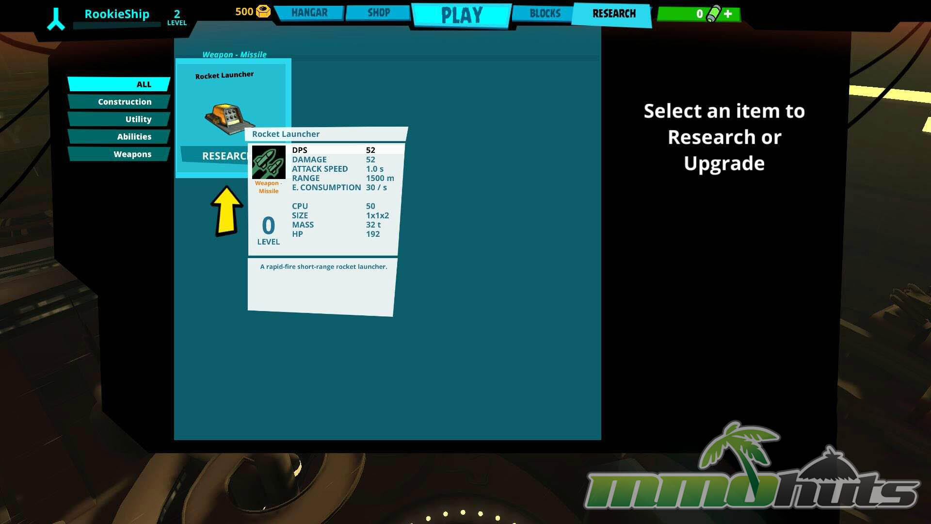 Build limits are controlled by a CPU cap tied to class and class level, which prevents extreme designs from dominating. The five classes are Rookie, Frigate, Cruiser, Battleship, and Destroyer. Faster, lighter ships like Frigates work with a smaller CPU budget, while slower, more durable Battleships can mount more blocks and survive longer under pressure. You begin as a Rookie and unlock the other four classes at Rookie level 10. Each class then levels separately, and leveling increases your max CPU and opens class-specific parts, including weapons and abilities.