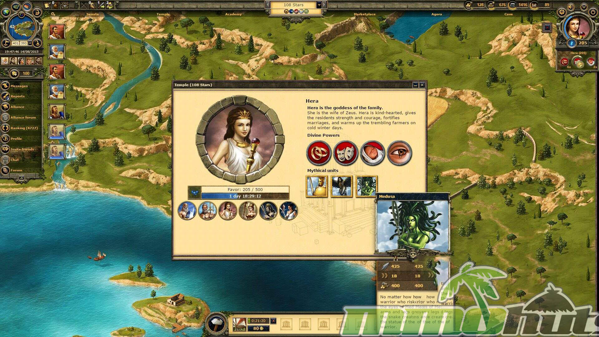Combat is split between land and sea, so expansion is not only about having a bigger army, it is also about controlling shipping lanes and timing naval pressure to support island warfare. Mythical creatures like Pegasus or Hydra add flavor, but they also function as specialized tools in the broader strategy of raids, sieges, and coordinated alliance operations. The game’s strongest strategic layer is multi-city play: once you have more than one polis, you can specialize them, run several academies for additional research potential, and diversify your god choices to broaden your overall toolkit.