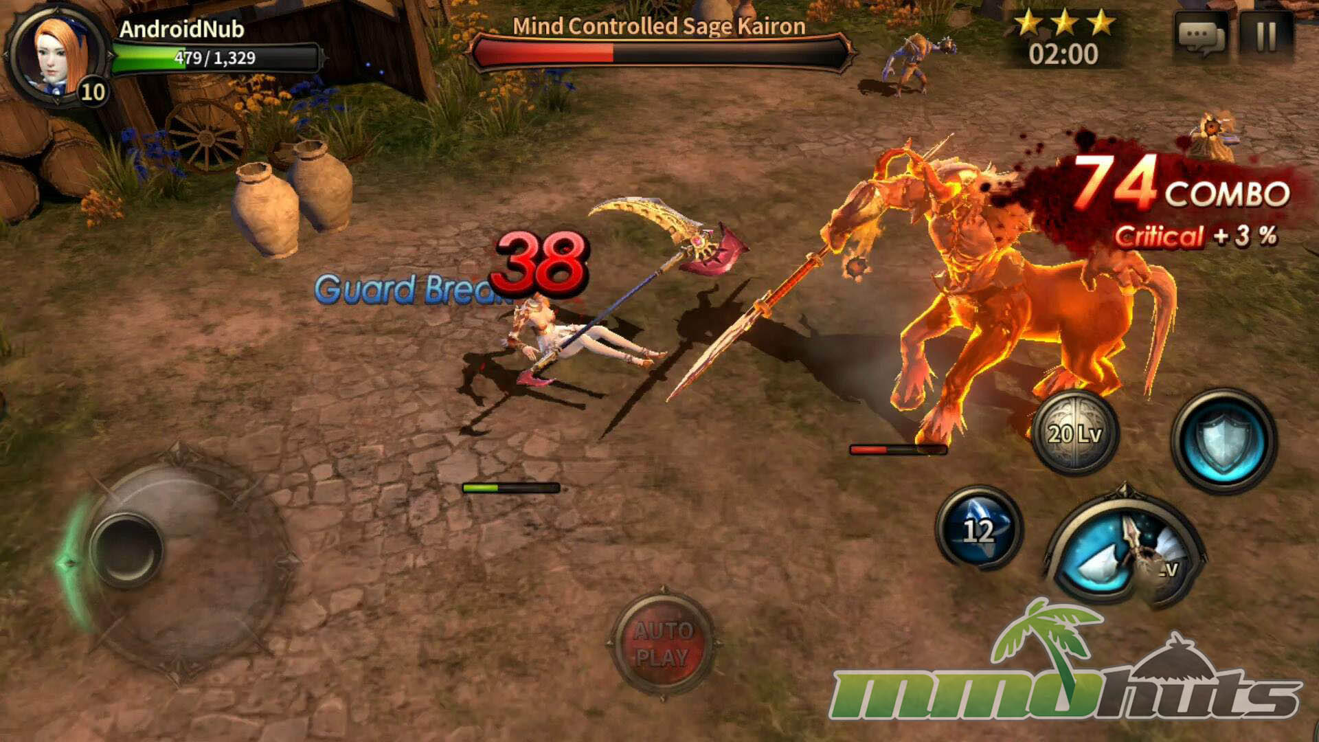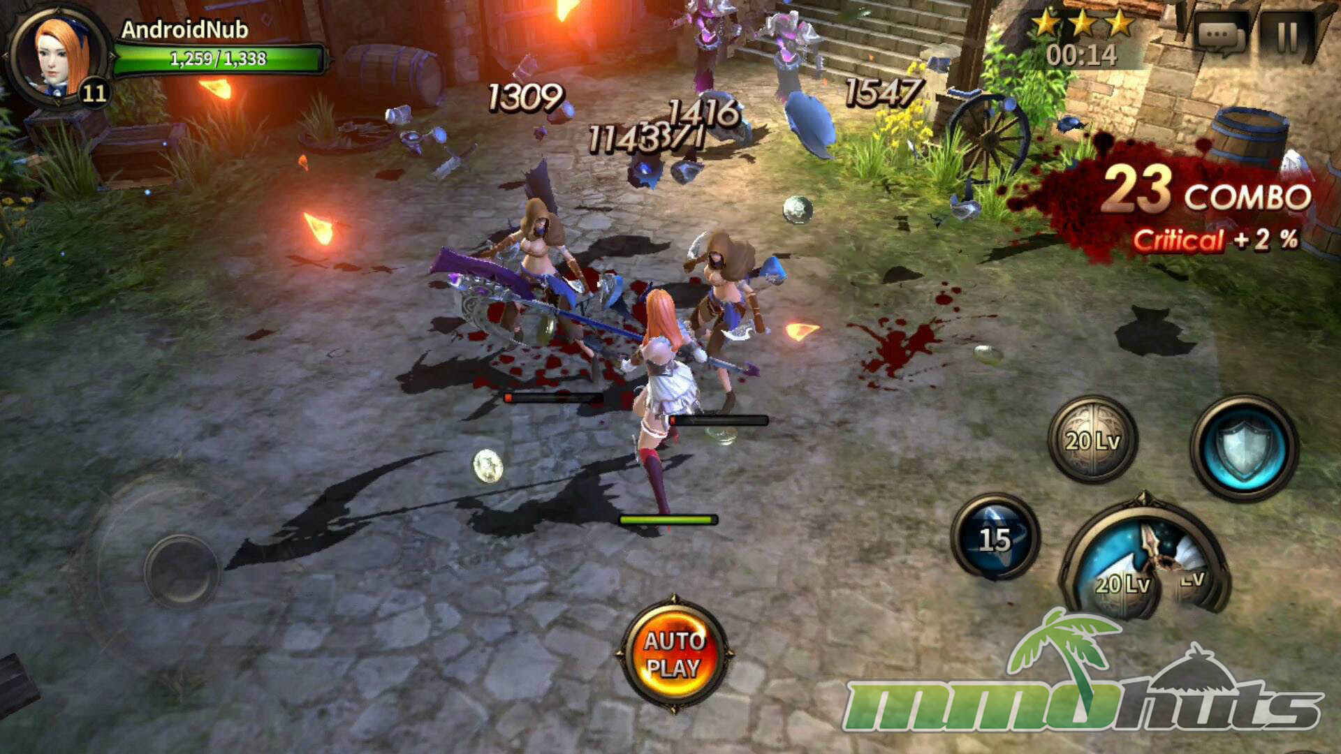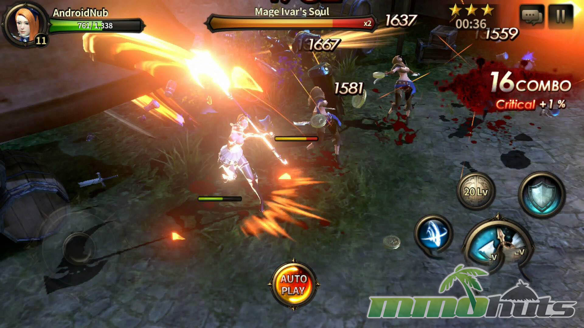 HIT’s moment-to-moment gameplay was built around a virtual joystick and a compact set of buttons for attacks, skills, and defense. Basic attacks could be tapped or held, skills were activated directly, and defense revolved around blocking and dodging. The key difference from many similar mobile RPGs was that blocking mattered. A block could fully negate incoming damage, and properly timed defense could trigger a counterattack, turning survival into an active skill check instead of a pure gear check.