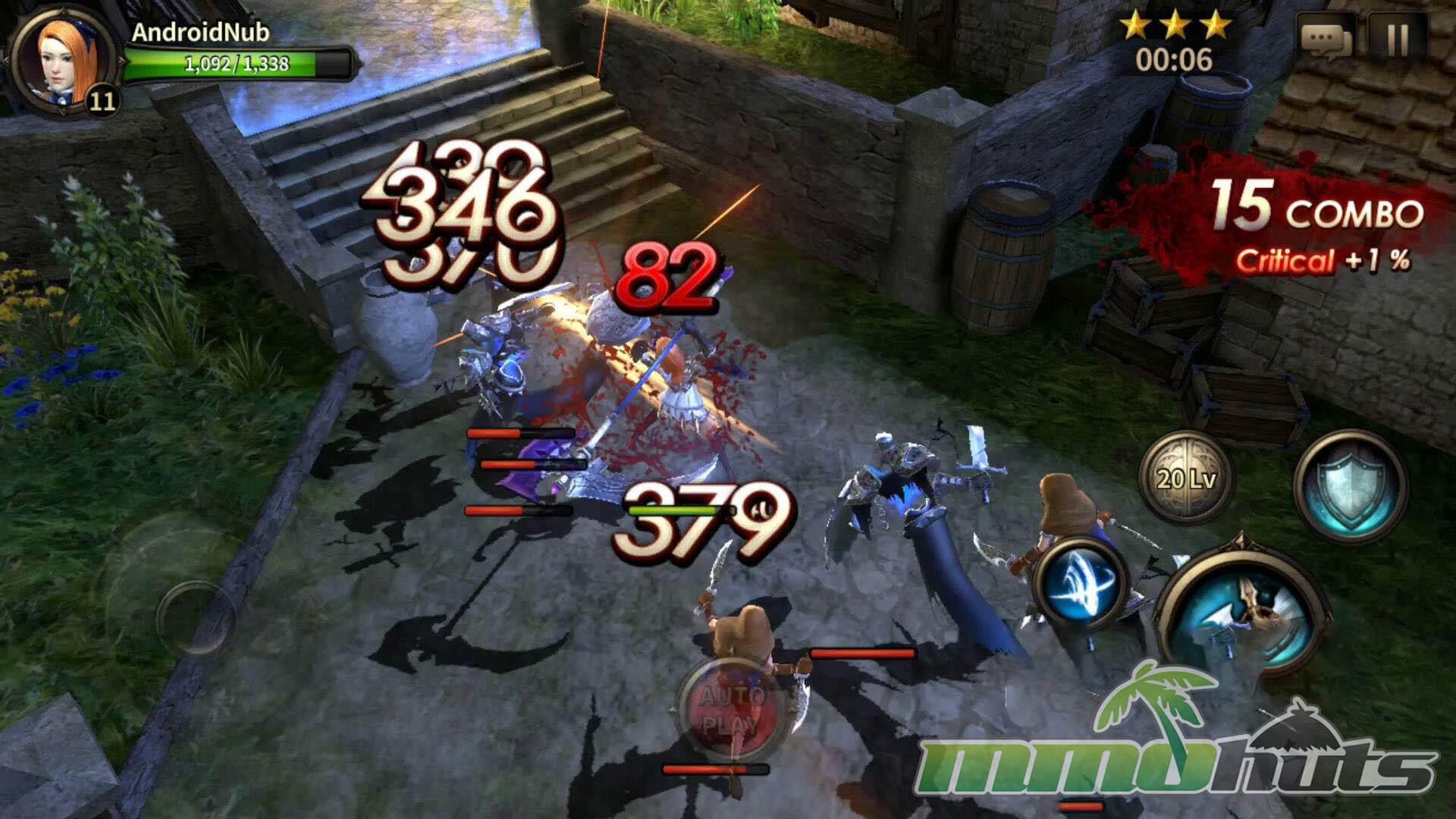 Visually, HIT was one of the standout mobile action RPGs of its time. Character models, armor sets, and weapon designs leaned toward a realistic medieval-fantasy style, and the lighting in particular gave stages a dramatic look with strong shadows and reflective highlights. Animations were responsive, and hit reactions (including knockback) made combat feel weighty rather than floaty.