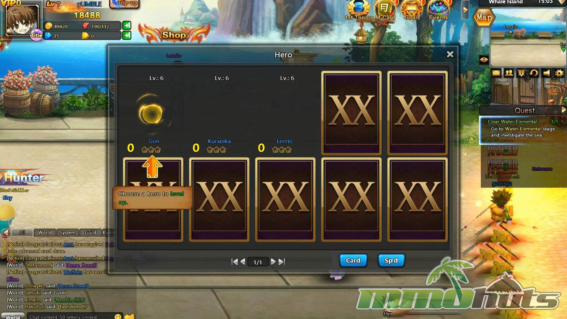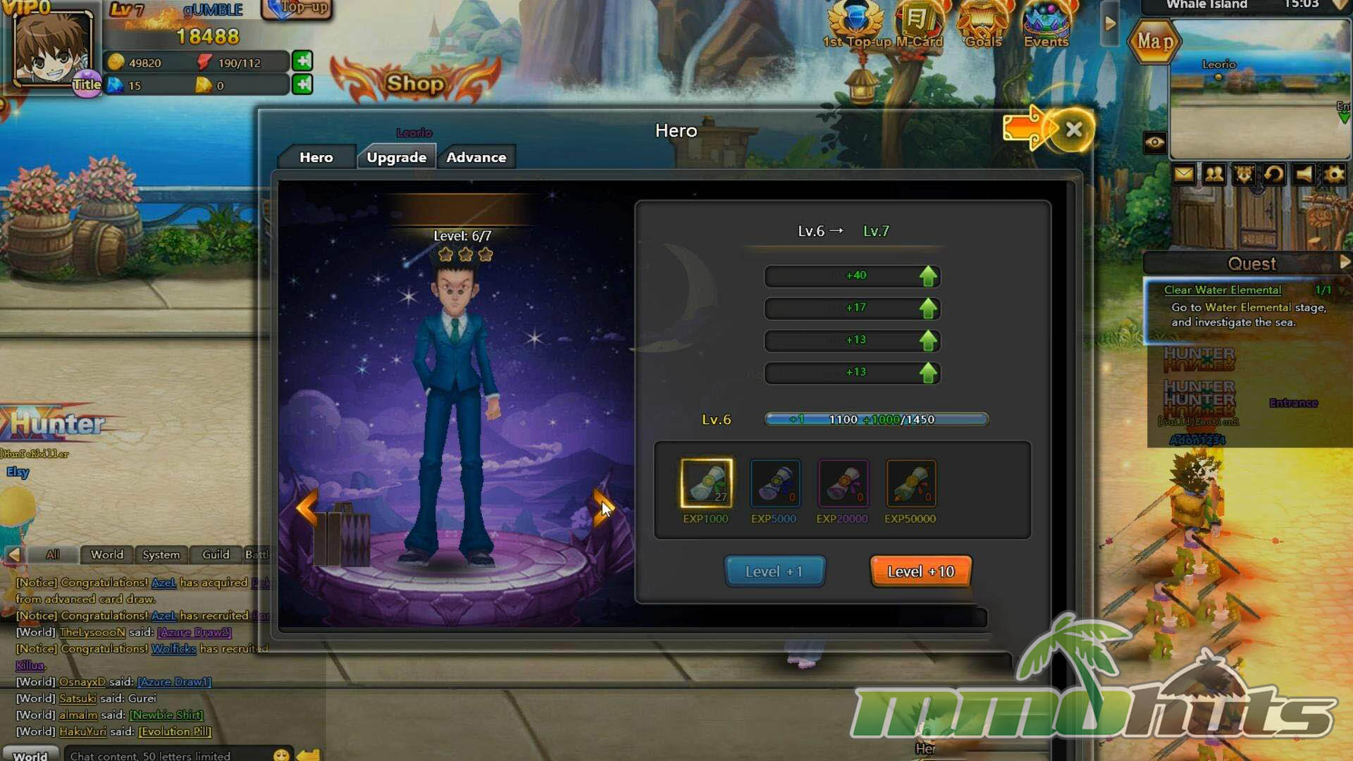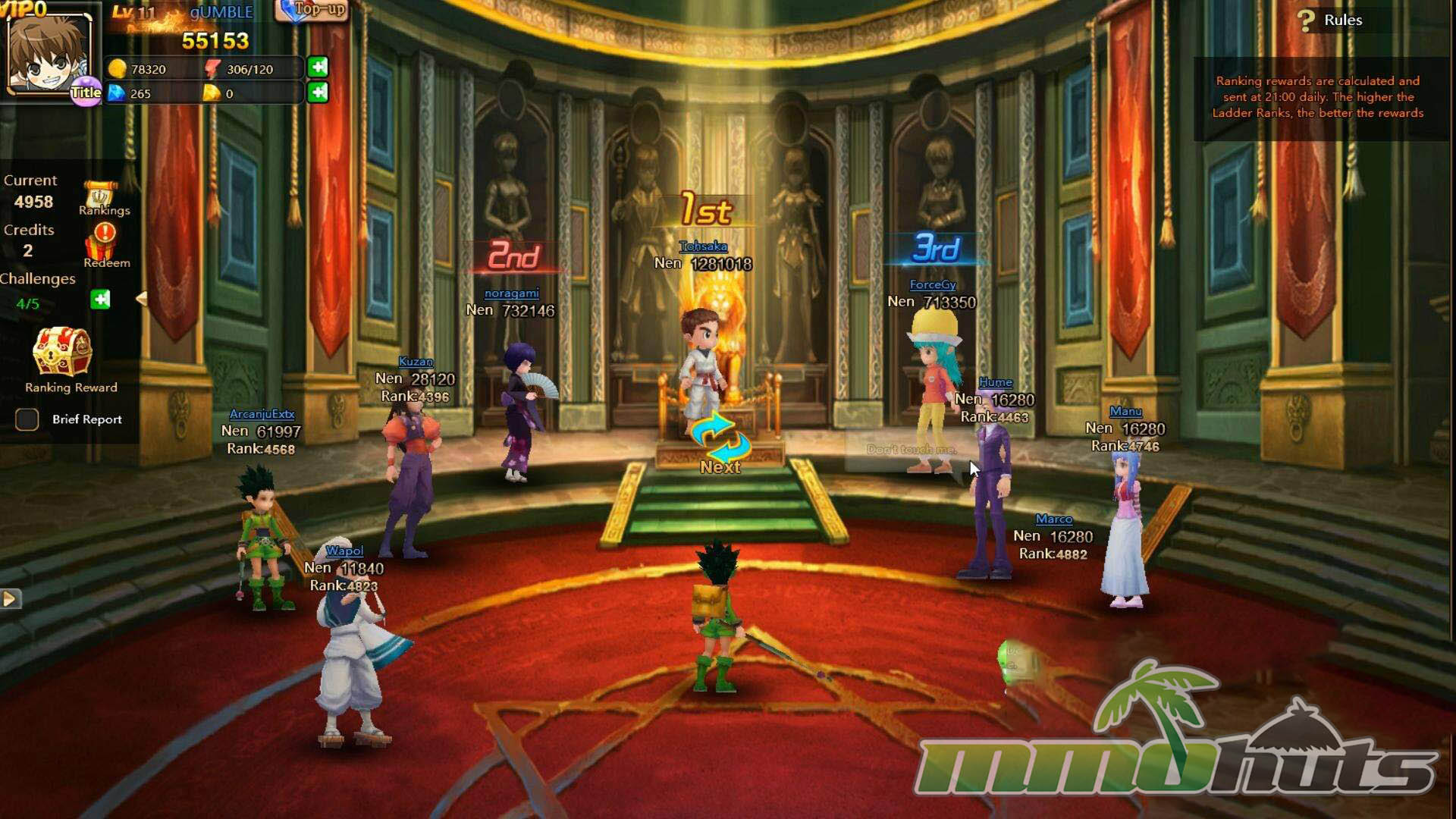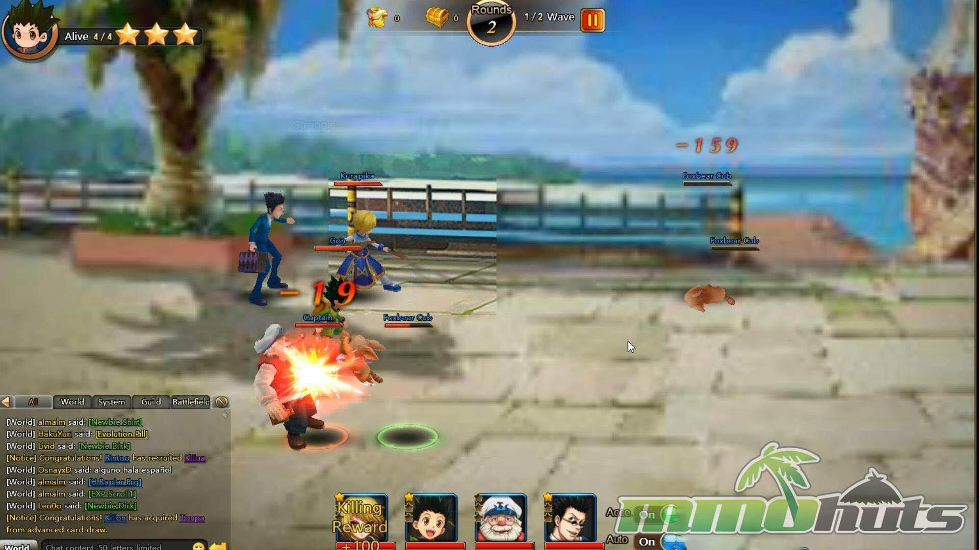 Hunter Online uses a familiar stage-by-stage browser RPG structure and places it inside the Hunter X Hunter universe. You move through the story with Gon and company as quests funnel you from one instanced fight to the next, unlocking additional chapters and systems as you go. Rather than roaming a large shared world, most playtime revolves around assembling a squad, boosting their stats, and clearing missions efficiently, making it feel more like a mission-hub RPG than a classic MMO with explorable zones.