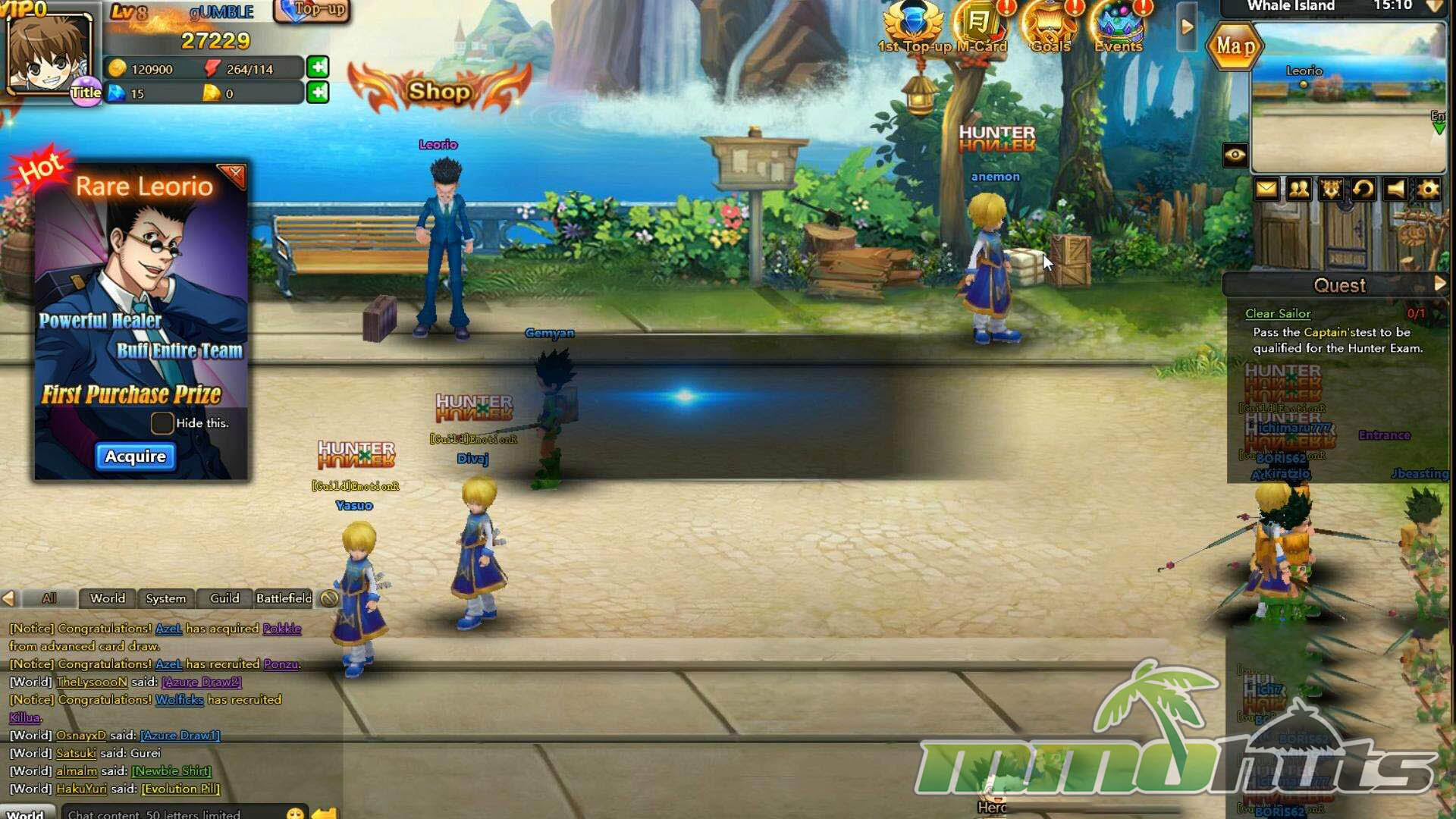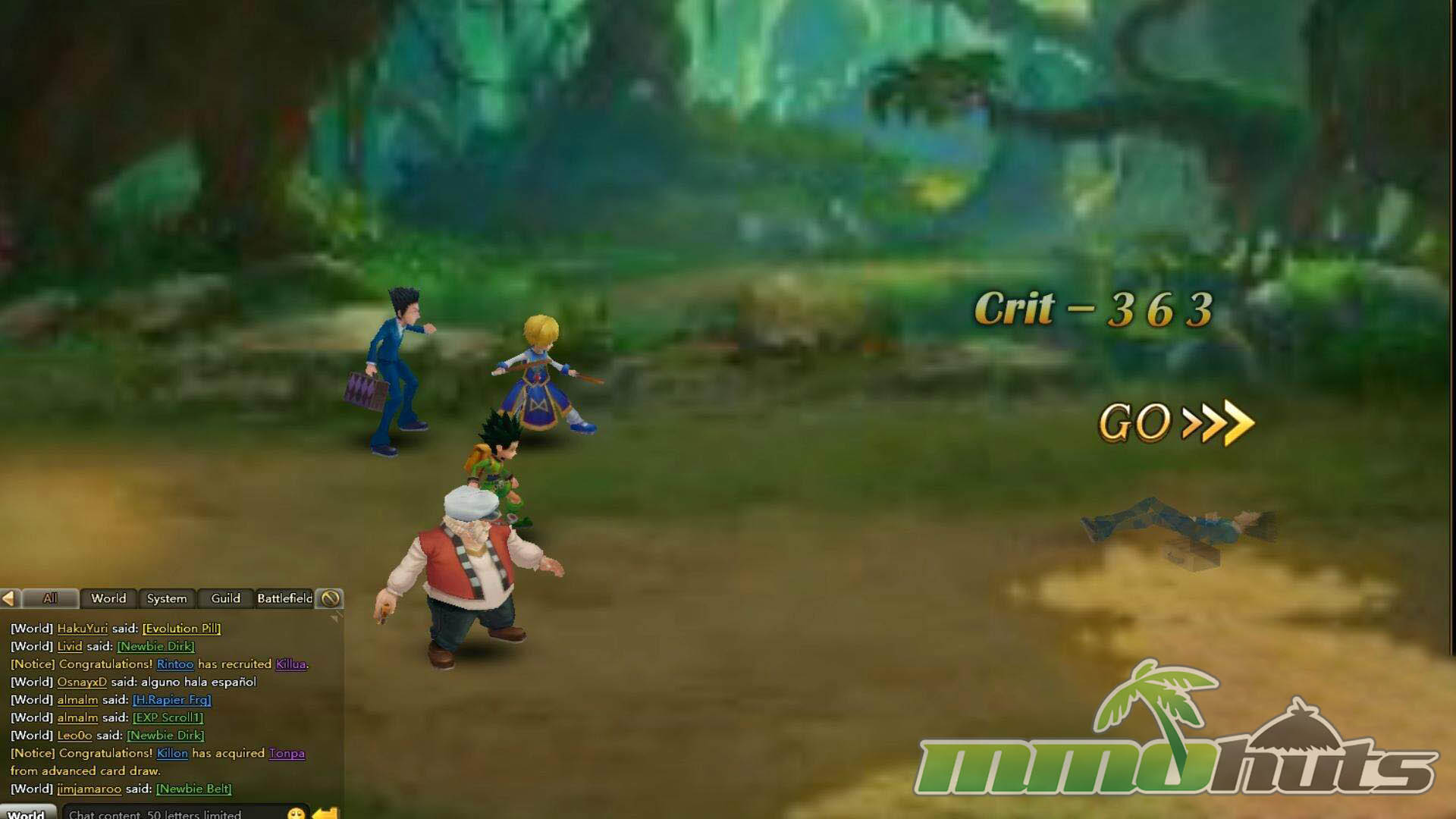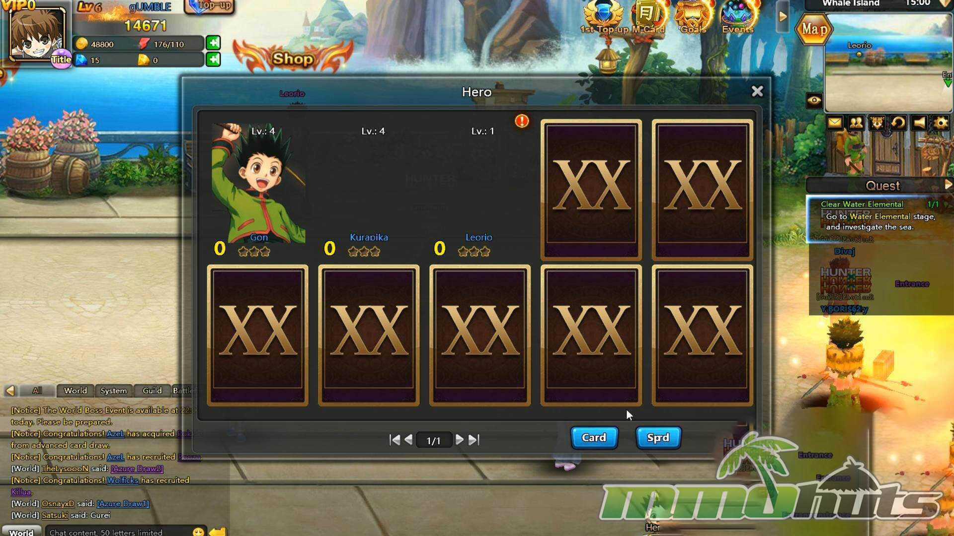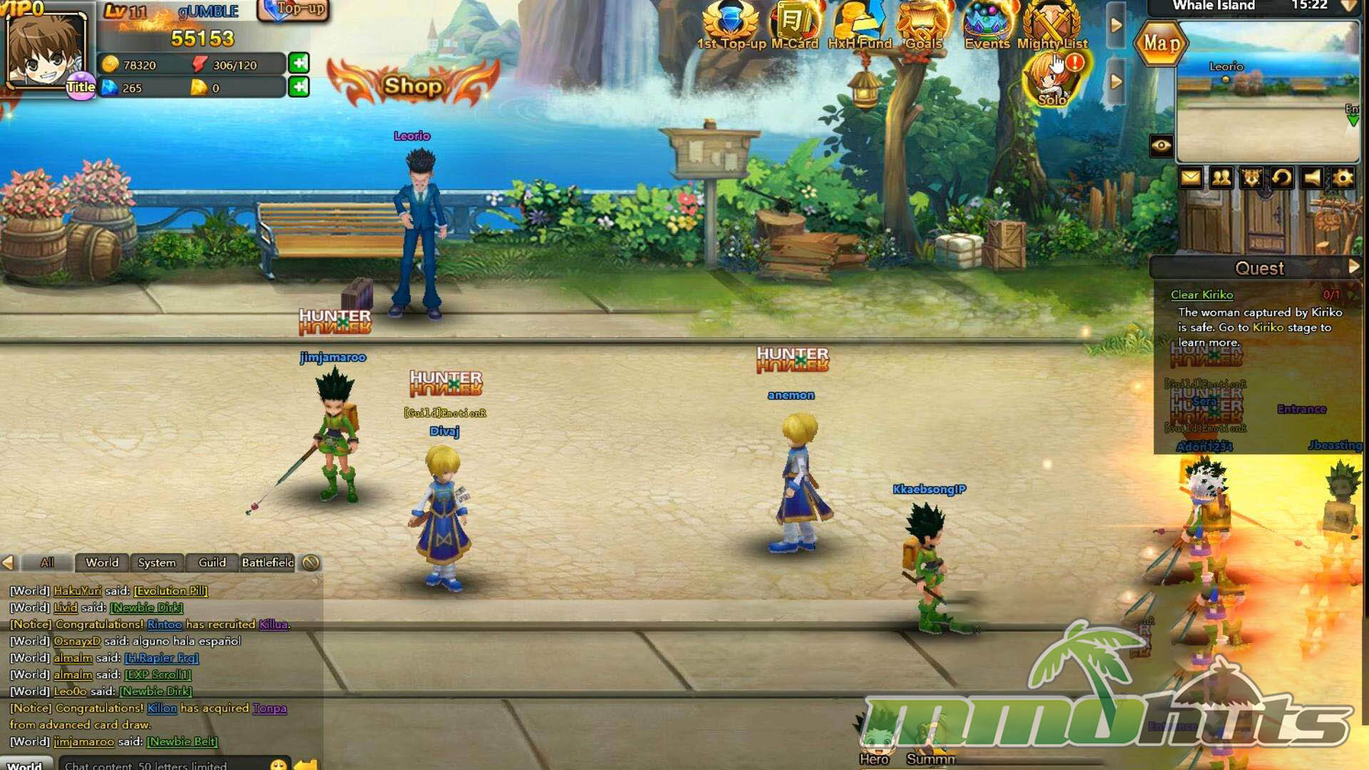 Hunter Online uses a familiar stage-by-stage browser RPG structure and places it inside the Hunter X Hunter universe. You move through the story with Gon and company as quests funnel you from one instanced fight to the next, unlocking additional chapters and systems as you go. Rather than roaming a large shared world, most playtime revolves around assembling a squad, boosting their stats, and clearing missions efficiently, making it feel more like a mission-hub RPG than a classic MMO with explorable zones.